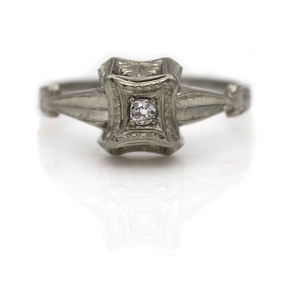 The Pauline ring is an authentic vintage diamond engagement ring from the Art Deco era circa 1930's. The ring showcases a .08 carat old mine-cut diamond of G color, VS2 clarity, residing in a two tiered geometric frame. Crafted in 14 karat white gold, beautifully finished with slightly tapered shoulders, delicate filigree engravings and a thin fluted band. A delightful vintage ring, in very good condition.