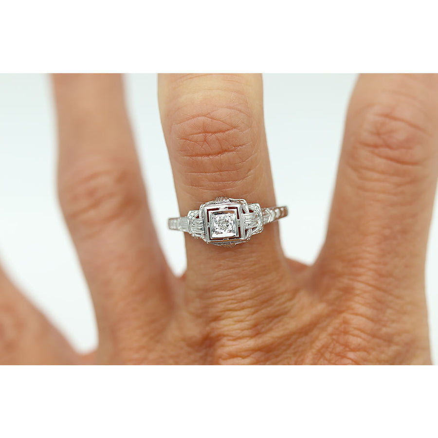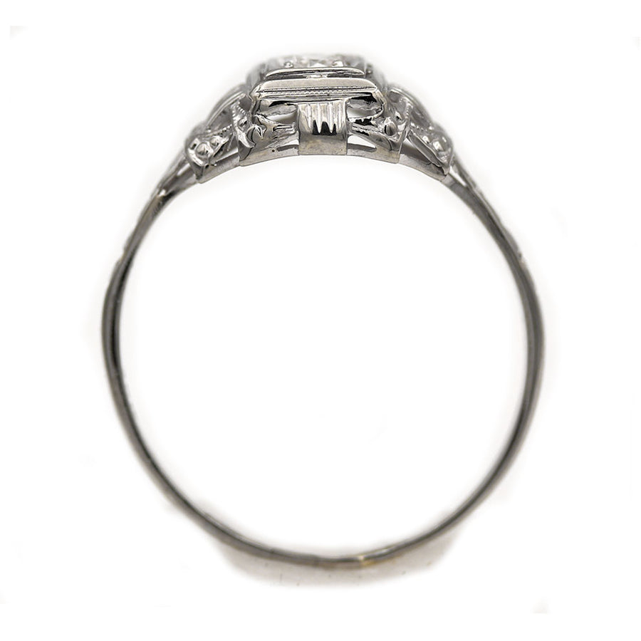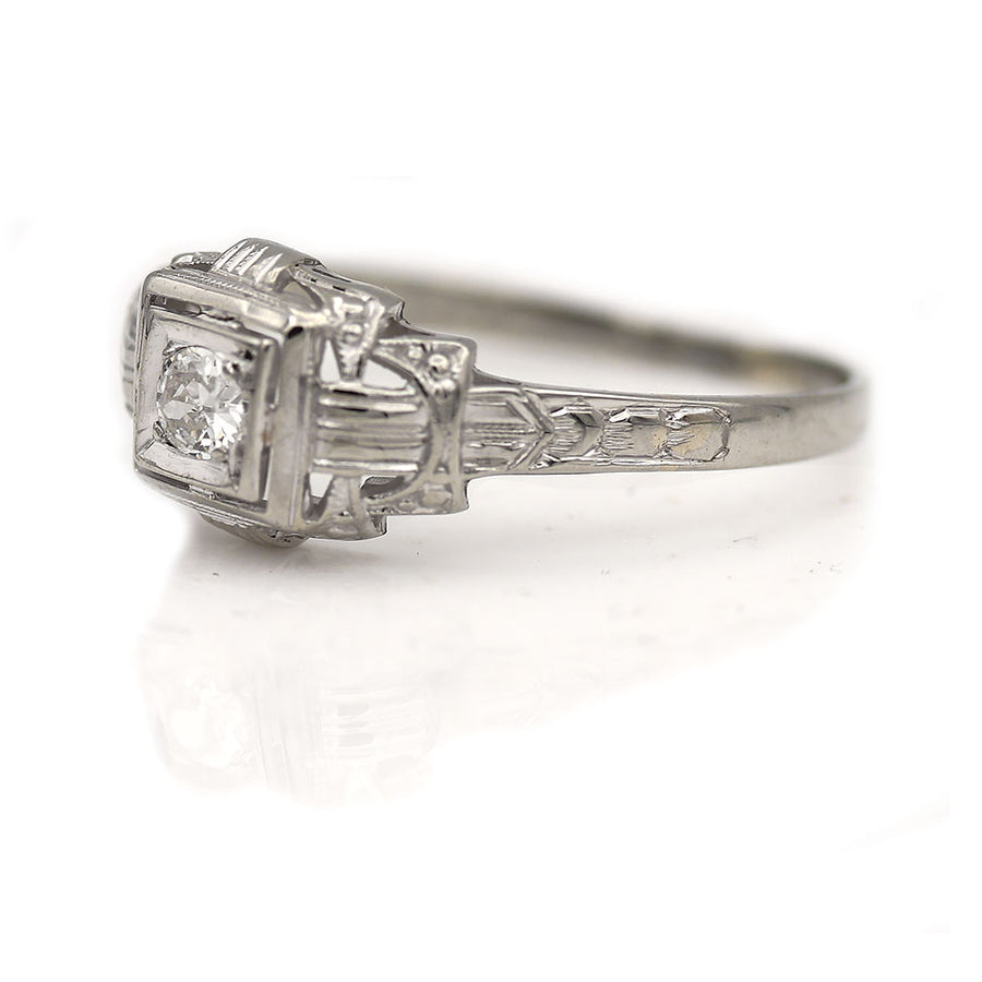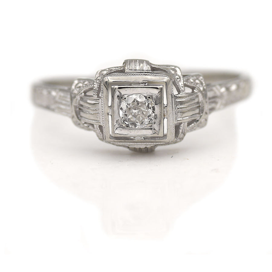 The Ellia ring is a delightful vintage engagement ring from the Art Deco era, circa 1930s. This ring features a delicate .15 carat old mine cut diamond of H color and VS2 clarity, residing within a two tiered geometric square frame. Crafted in 18 kt white gold, and accentuated with delicate milgrain engravings, this ring is as sweet as a vintage ring can be. In very good condition.