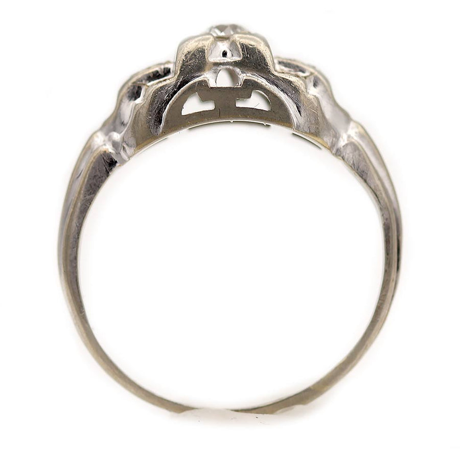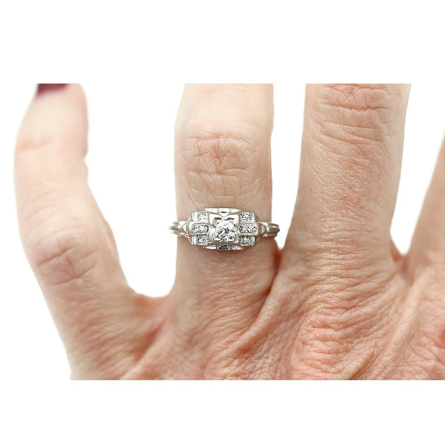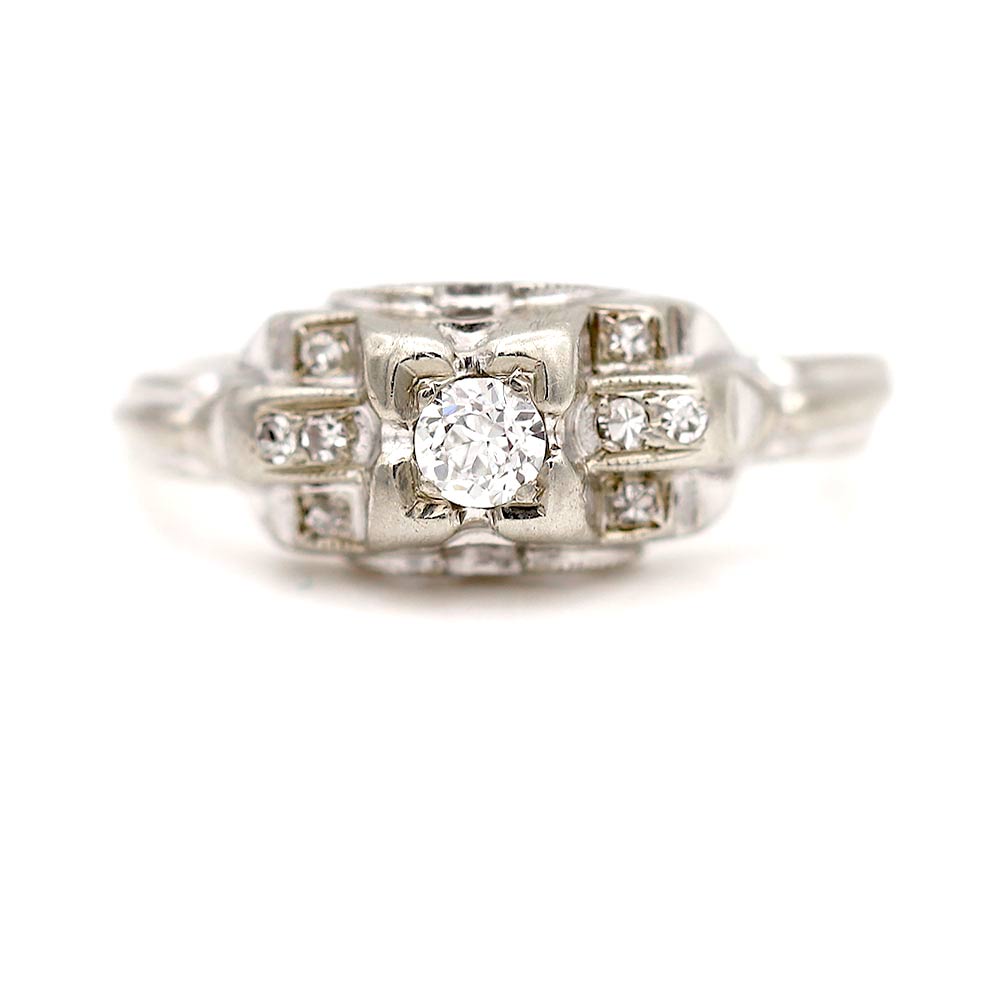 The Dinah ring is an authentic antique engagement ring from the Art Deco era circa 1930's. The ring features a sparkling .15 carat old European cut diamond of G color, VS2 clarity, residing within a geometric square frame. The diamond is flanked by 8 single cut diamond accents. Crafted in 14 karat white gold, completed with delicate milgrain engravings. An elegant and classic Art Deco piece. In very good condition.