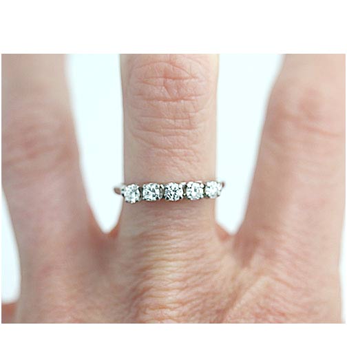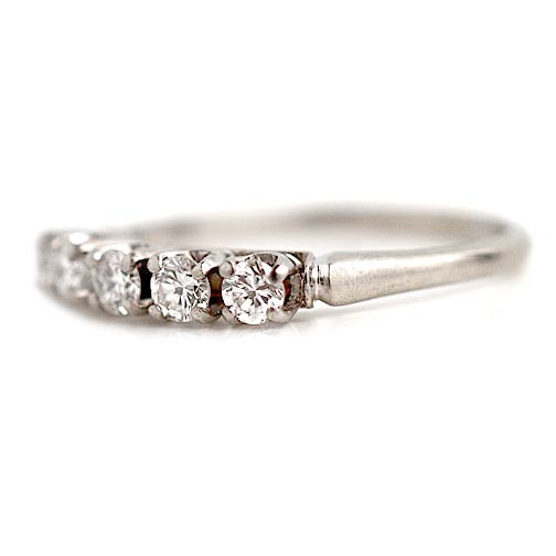 The Cassie ring is an authentic vintage wedding band featuring 5 round brilliant diamonds weighing .40 carat (F color, VS2 clarity). Crafted in the 1970's in 14 Kt white gold. Perfect as a complement with your vintage engagement ring. In good condition.