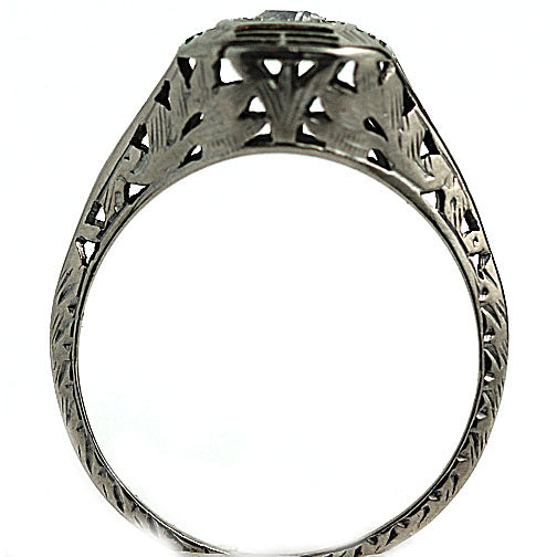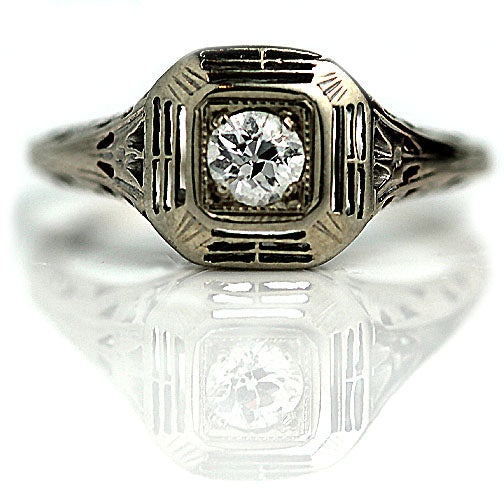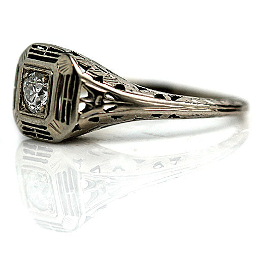 The Kyra ring is an authentic vintage engagement ring from the Art Deco era circa 1930's. The ring features a bright-white .30 carat old European-cut diamond of E color, VS2 clarity, residing from within a square openwork frame. Crafted in 14 karat white gold, completed with delicate filigree engravings. A free flowing, distinctive piece! In very good condition.