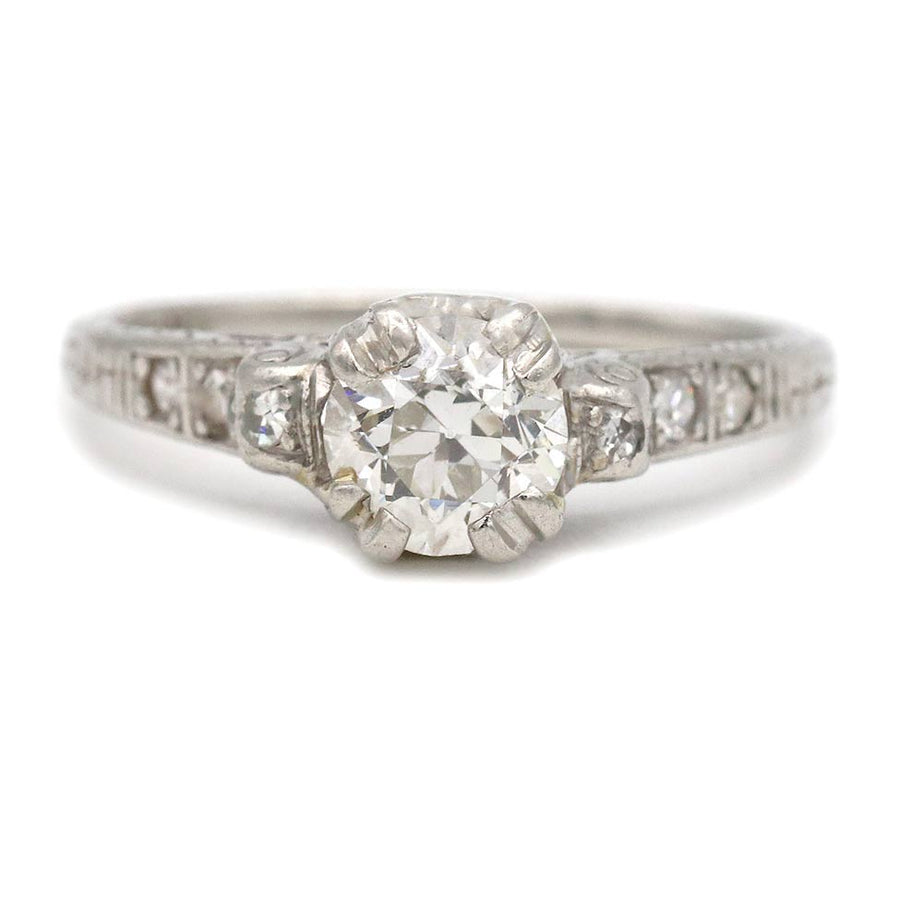 The Lila ring is an authentic Art Deco engagement ring. The ring boasts an AGI certified .70 carat old European cut diamond of J color, VS2 clarity. The diamond is flanked by 8 single cut diamond accents. The diamond resides in a 4 double prong platinum setting. Crafted in the 1940s, accentuated with scrolling metal work and filigree engravings. A showstopping ring featuring a bright-white antique diamond and intricate detailing. In good condition.