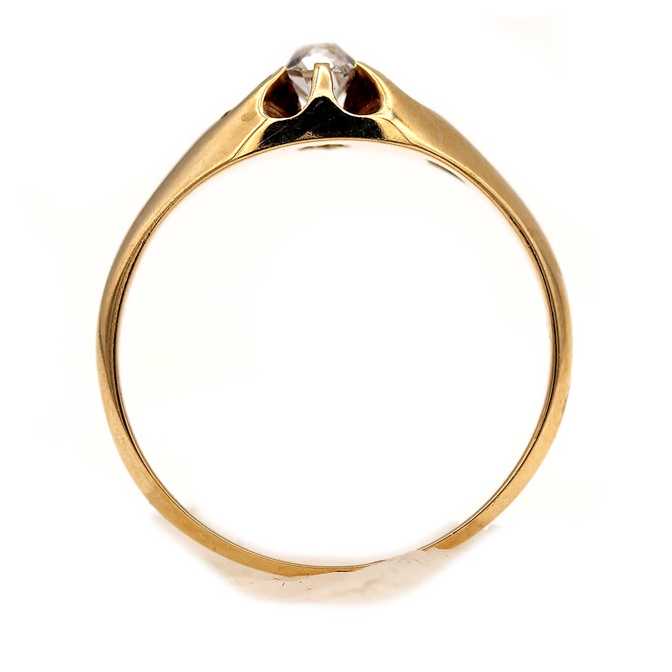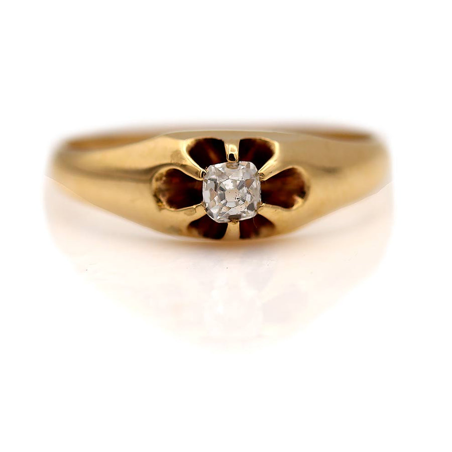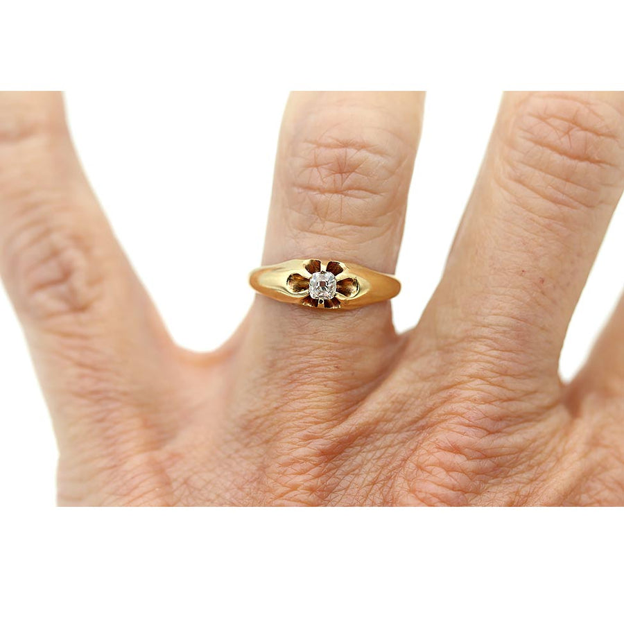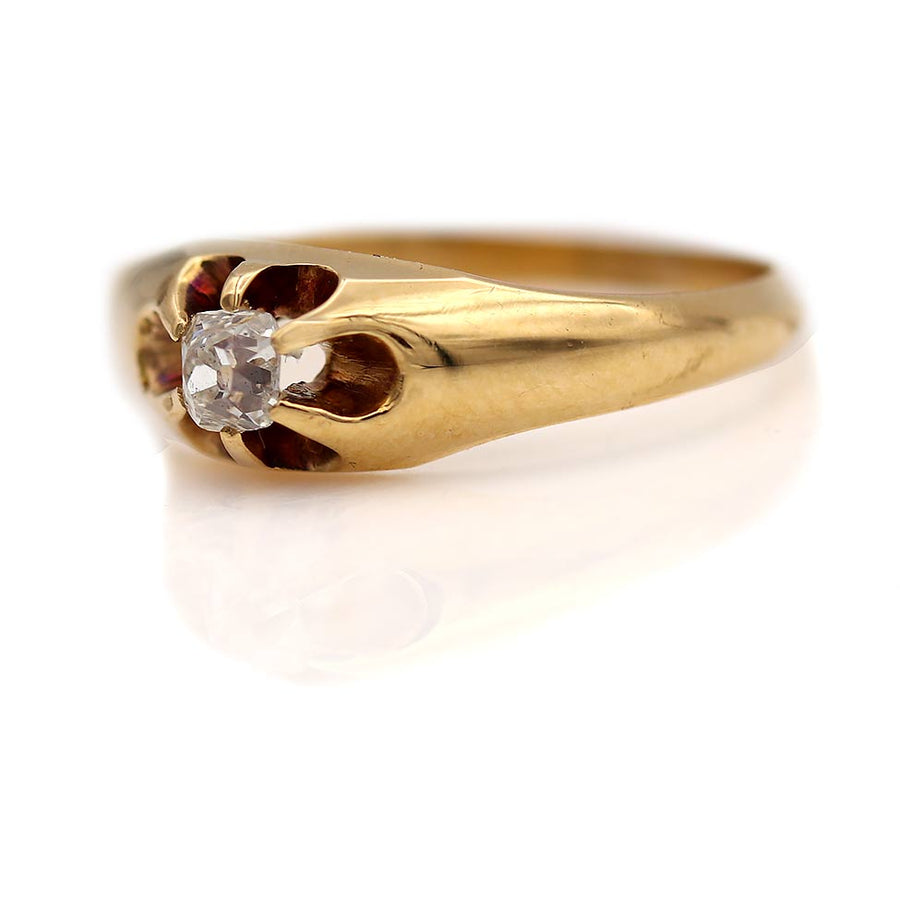 The Donaldson ring is an authentic vintage engagement ring from the Victorian era ,circa 1900's. This ring features a .15 carat old cushion cut diamond of H color and SI1 clarity, residing within a six (6) prong buttercup setting. Beautifully crafted in 10 kt rosy-yellow gold and as sweet as can be. In very good condition.