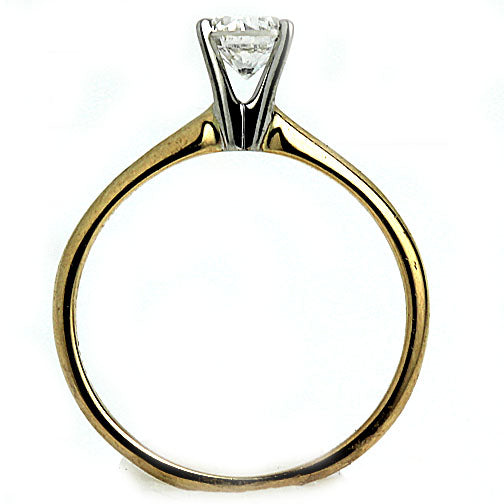 The Tellie ring is a classic vintage engagement ring circa 1940's.  The ring features a .51 carat GIA certified brilliant cut diamond of H color and I1 clarity.  Crafted in 14K white gold prongs atop a 14 kt yellow gold ring. A classic engagement ring.