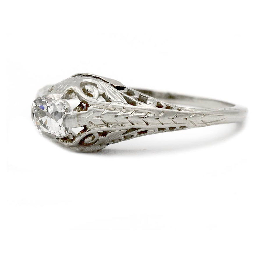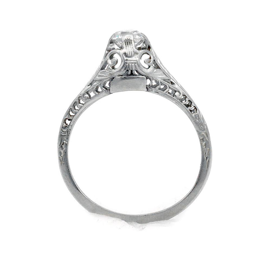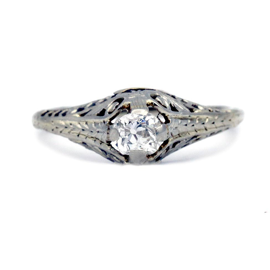 The perfect Art Deco engagement ring to say YES to! Aja is a classic Art Deco engagement ring featuring a breathtaking .35 carat mine cut diamond. Beautifully crafted in the 1930's in 18 kt white gold, finished with delicate filigree engravings. A captivating solitaire ring, in very good condition.