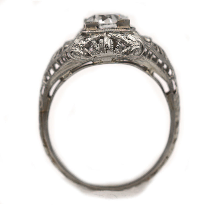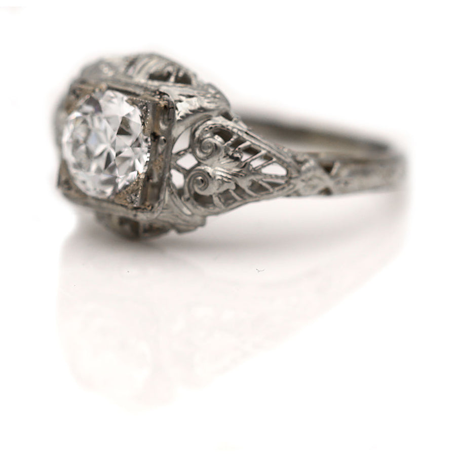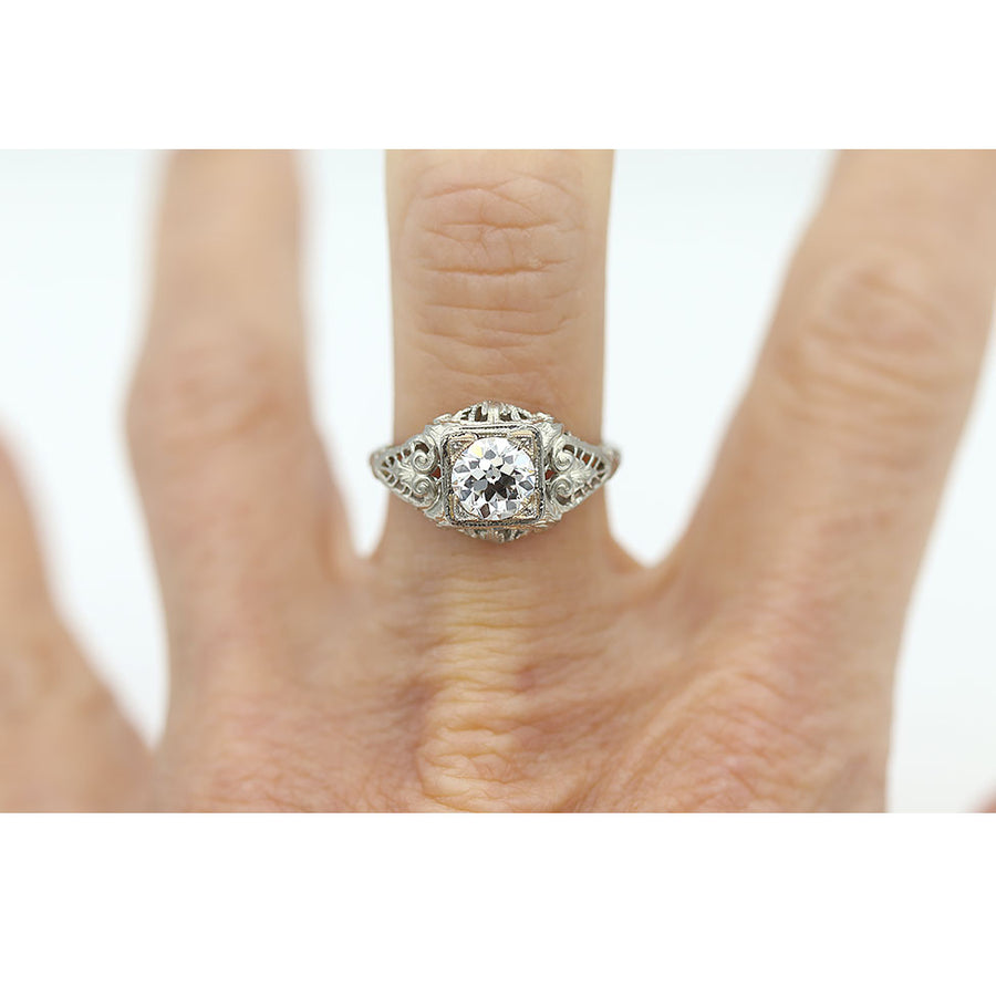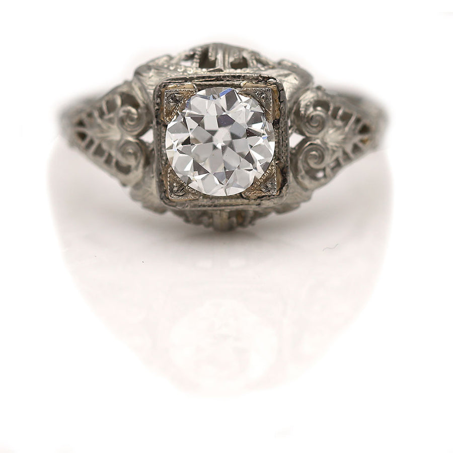 The Rosalind A ring is an authentic vintage diamond engagement ring from the Art Deco era circa 1930s. The ring boasts a GIA certified .97 carat old European cut diamond of H color, SI2 clarity, residing within a geometric square milgrain frame. Beautifully crafted in 18 karat white gold, accentuated with swirling metal work and delicate filigree engravings. A vintage treasure. In pristine condition.