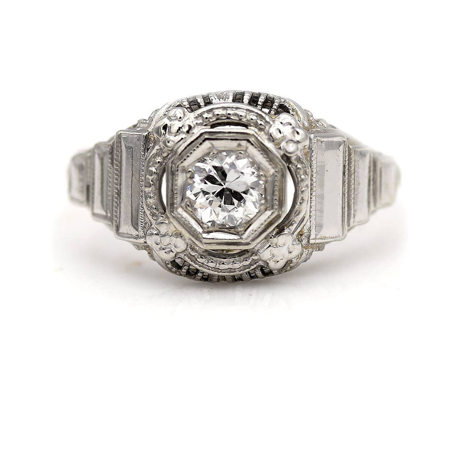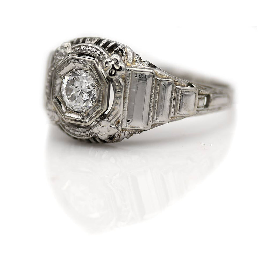 The Bebel ring is an authentic vintage engagement ring from the Art Deco era circa 1930's. This unique vintage octagon engagement ring features a dazzling .30 carat old European cut diamond of F color, SI2 clarity. The diamond resides in a geometric octagonal frame, flanked by side tiered engravings. Crafted in 18 karat white gold, accentuated with open metal work and delicate floral engravings. A chic, sophisticated solitaire ring. In very good condition.