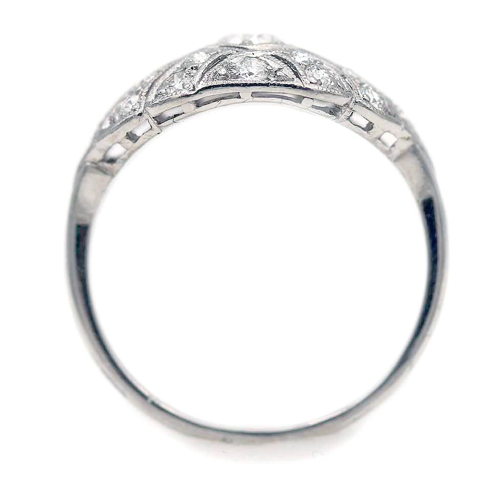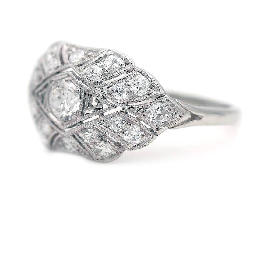 The Goldpiroul ring is an authentic vintage engagement ring from the Edwardian era, circa 1920s. The ring features a .35 carat old European cut diamond of F color and VS2 clarity, residing within a geometric square frame, surrounded by twenty (20) old mine cut diamond accents. Beautifully crafted in platinum, and accentuated with delicate milgrain engravings. An Edwardian jewel! In very good condition. Magnifique!
