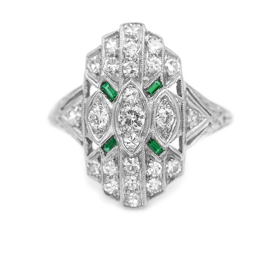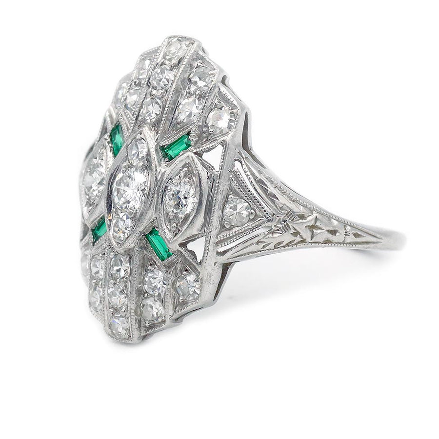 The Caroline ring is an authentic Art Deco cocktail ring from the 1930s, centered with a .15 carat old European cut diamond graded F color and VS2 clarity, flanked by two navette-framed single cut diamond accents. The design is further detailed with four synthetic baguette emeralds and twenty-two single cut diamond accents, bringing the total diamond weight to approximately 1.03 carats. Handcrafted in platinum, the ring is finished with open metalwork, fine filigree, and delicate milgrain engravings characteristic of the Art Deco era. An elegant and timeless vintage cocktail ring in very good condition, suitable to wear on either hand.