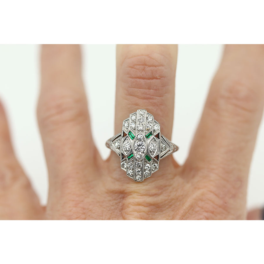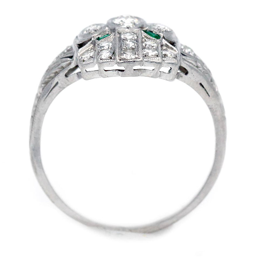 Art Deco European Cut Diamond and Emerald Platinum Cocktail Ring | Circa 1930s