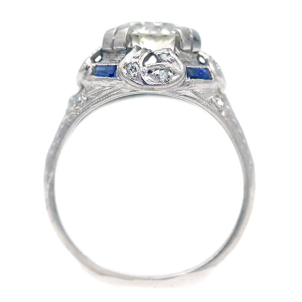 The Proulx ring is an authentic Art Deco engagement ring dating to the 1930s, centered with a glittering 1.83 carat GIA-certified old European cut diamond graded K color and I1 clarity. The center stone is framed by four vintage synthetic baguette-cut sapphires and accented by sixteen single-cut diamonds, creating the striking geometry and contrast characteristic of Art Deco design. Beautifully crafted in platinum and finished with fine milgrain engraving, the ring reflects the bold elegance and craftsmanship of the period. A distinctive vintage engagement ring offered in very good vintage condition.