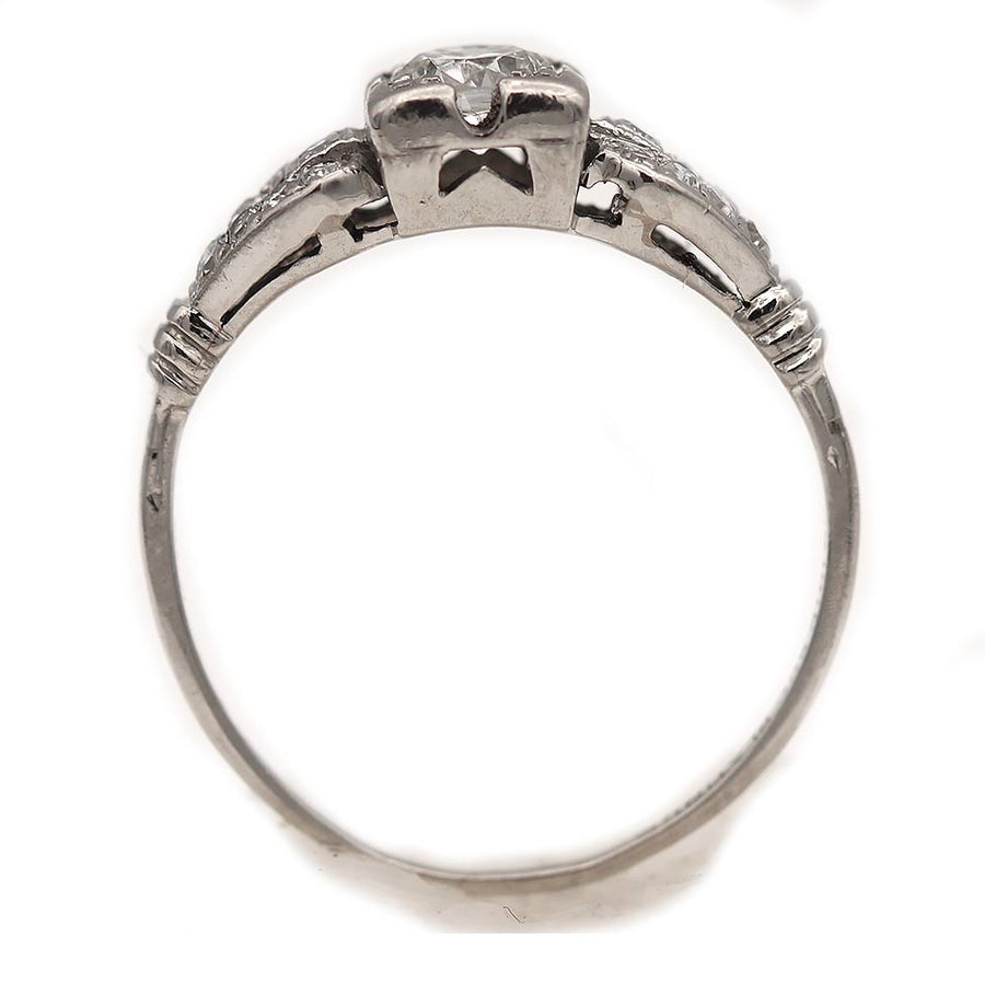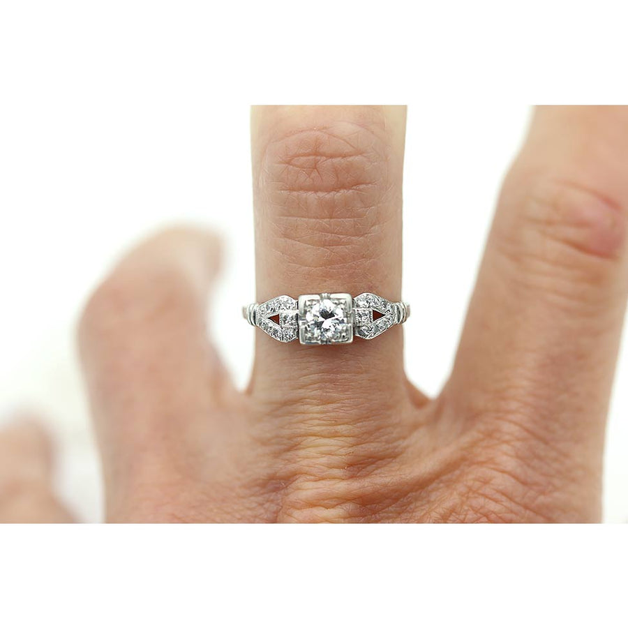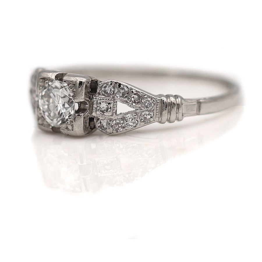 The Lawson ring is an authentic vintage engagement ring from the Art Deco era, circa 1930's. This ring features a glittering .30 carat old European cut diamond with F color and VS2 clarity, residing within a geometric square frame, flanked by eighteen (18) single cut diamond accents and set with a delicate split shank. Beautifully crafted in platinum. As lovely and sweet as can be and in very good condition. x1vv0