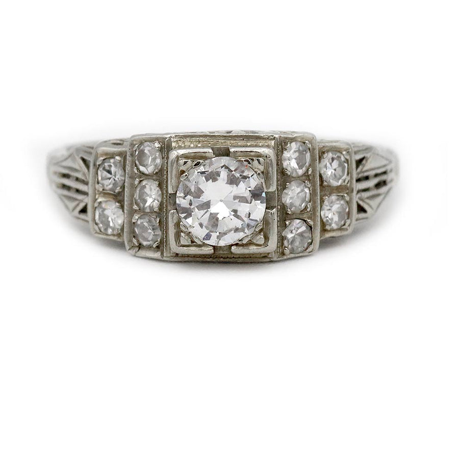 The Corelli ring is an authentic Art Deco engagement ring, circa 1940s. This ring features a .35 carat transitional cut diamond with F color and VS2 clarity, residing in a two-tiered geometric square frame. Flanked by ten (10) single cut diamond accents, this diamond resides in a two tier frame, all beautifully crafted in 14 kt white gold, and accentuated with open metal work and filigree engravings. As lovely as can be. In very good condition.