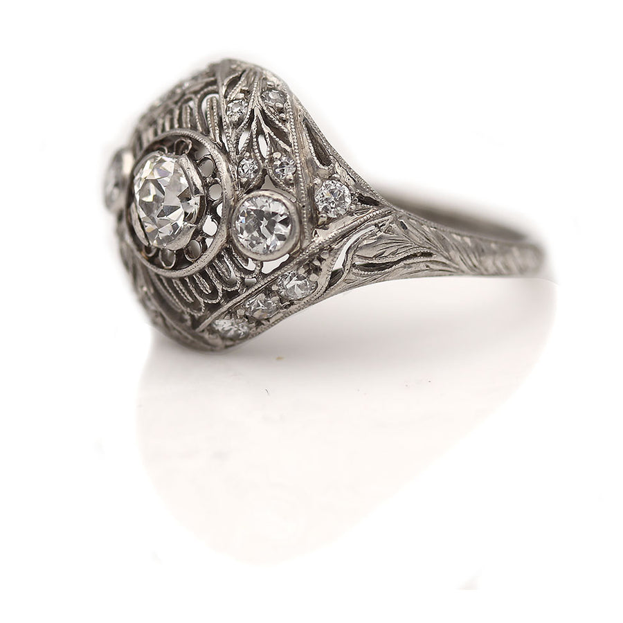 The Jayne ring is an authentic vintage engagement ring from the Edwardian era circa 1920's. The ring showcases a .40 carat mine cut diamond of H color, VS2 clarity. The diamond is set in a circular open faced setting, flanked by 2 bezel set mine cut diamonds and surrounded by 18 mine and single cut diamond accents. Beautifully crafted in platinum, adorned with milgrain engravings and swirls of intricate metal work. A remarkable piece! In very good condition.