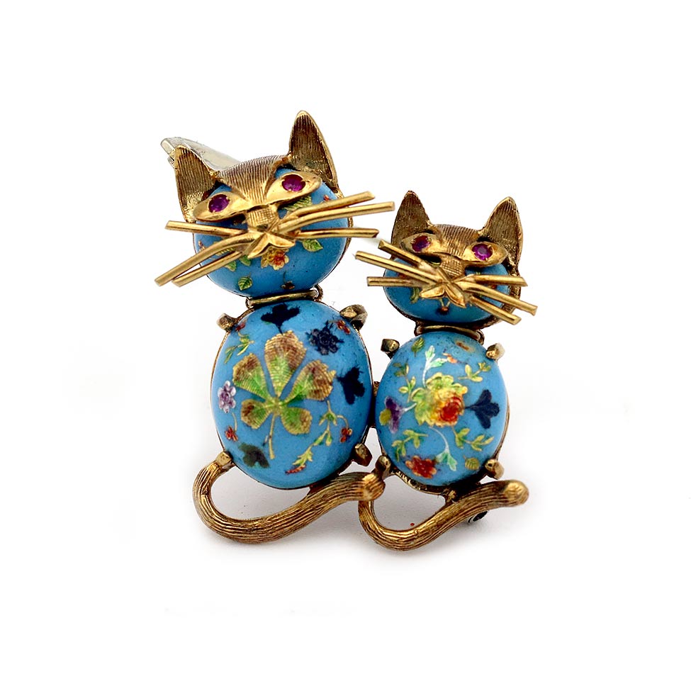 18 Kt Yellow Gold Ruby and Enamel Twin Cat Brooch