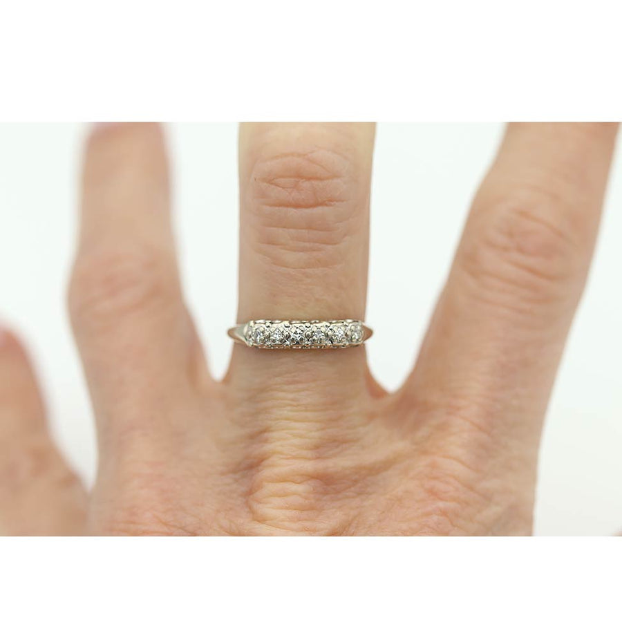 Kena is an authentic vintage wedding band circa 1950's. The wedding band features six (6) prong set single cut diamonds, weighing .12 carat (G color and VS2 clarity). Crafted in 14kt white gold. A perfect band to stack or wear with your favorite vintage ring. In very good condition, this band measures 3.5 wide tapering to 3.1 and 1.4 at the bottom.