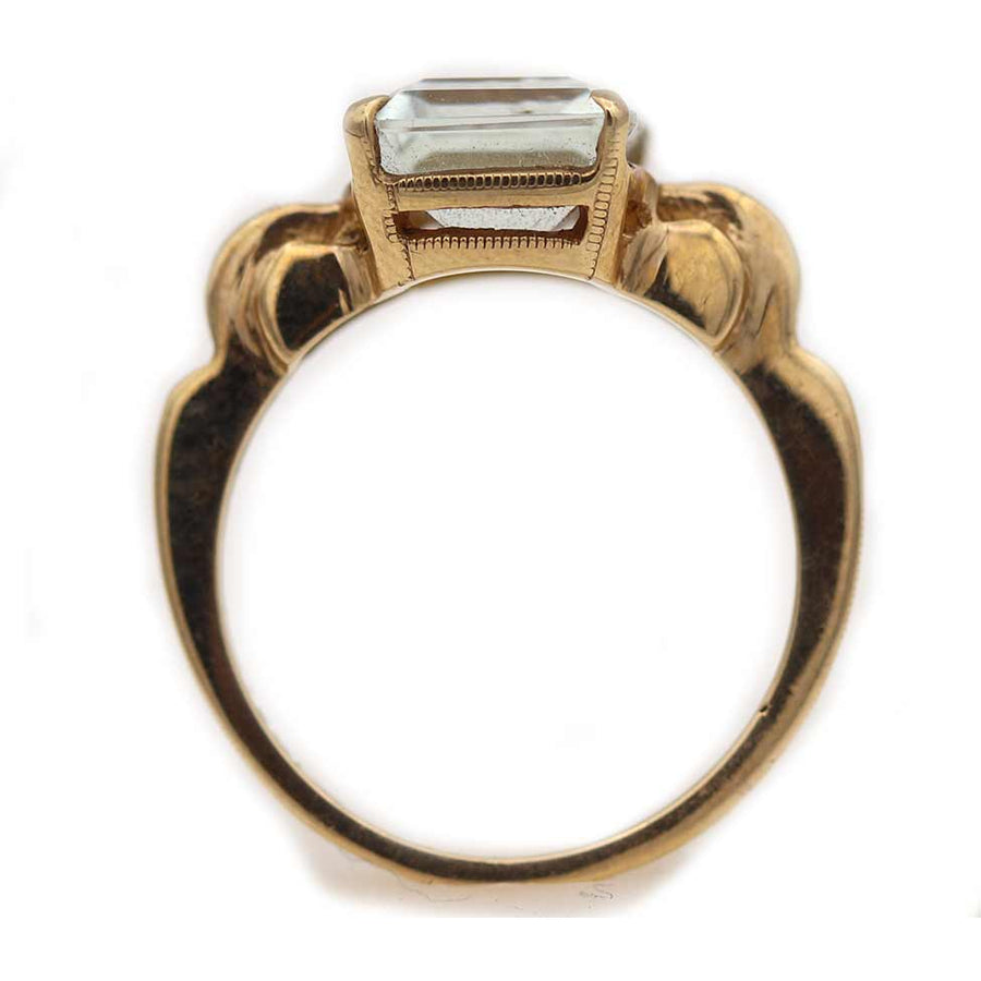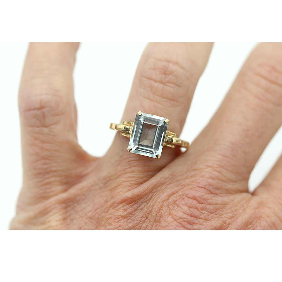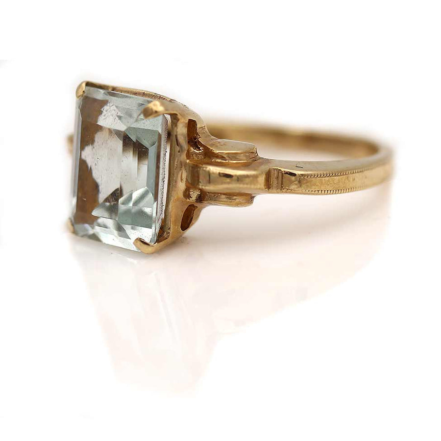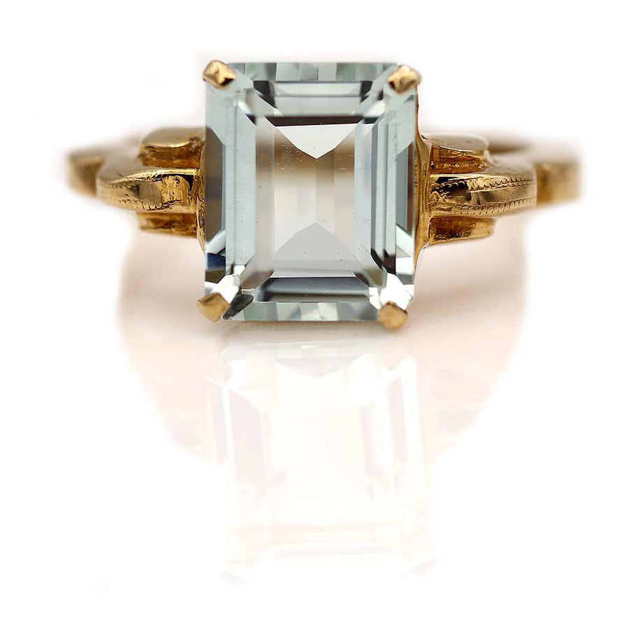 The Marling ring is an authentic Victorian aquamarine engagement ring, circa 1900s. This ring features a natural placid blue, square cut aquamarine weighing approximately 2.50 carat. Beautifully crafted in 10 kt rosy-yellow gold, and accentuated with delicate milgrain engravings. A sweet Victorian jewel, in very good condition.