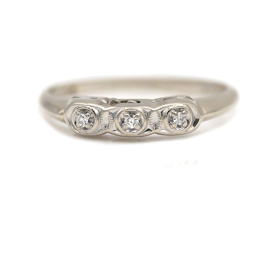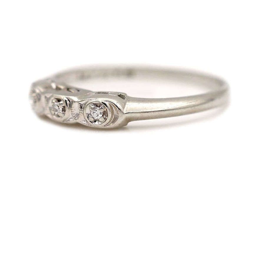 Lexa is a delicate vintage diamond wedding band featuring three (3) single cut diamonds, weighing .05 carat with F color, VS2 clarity. Crafted in 14 kt white gold circa 1950's. A perfect band to stack. In very good condition. This band measures 3.2 wide tapering to 2.1 and 1.2 at the bottom.
