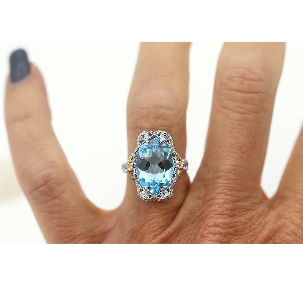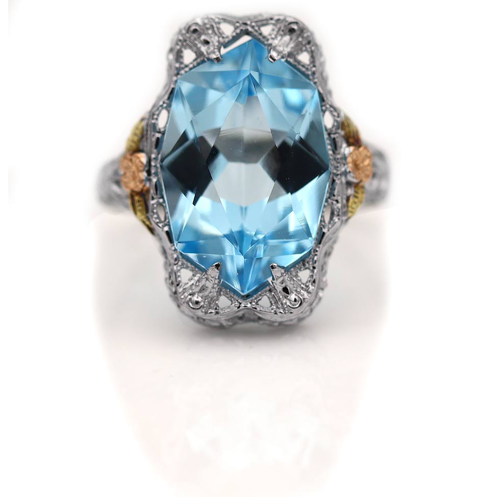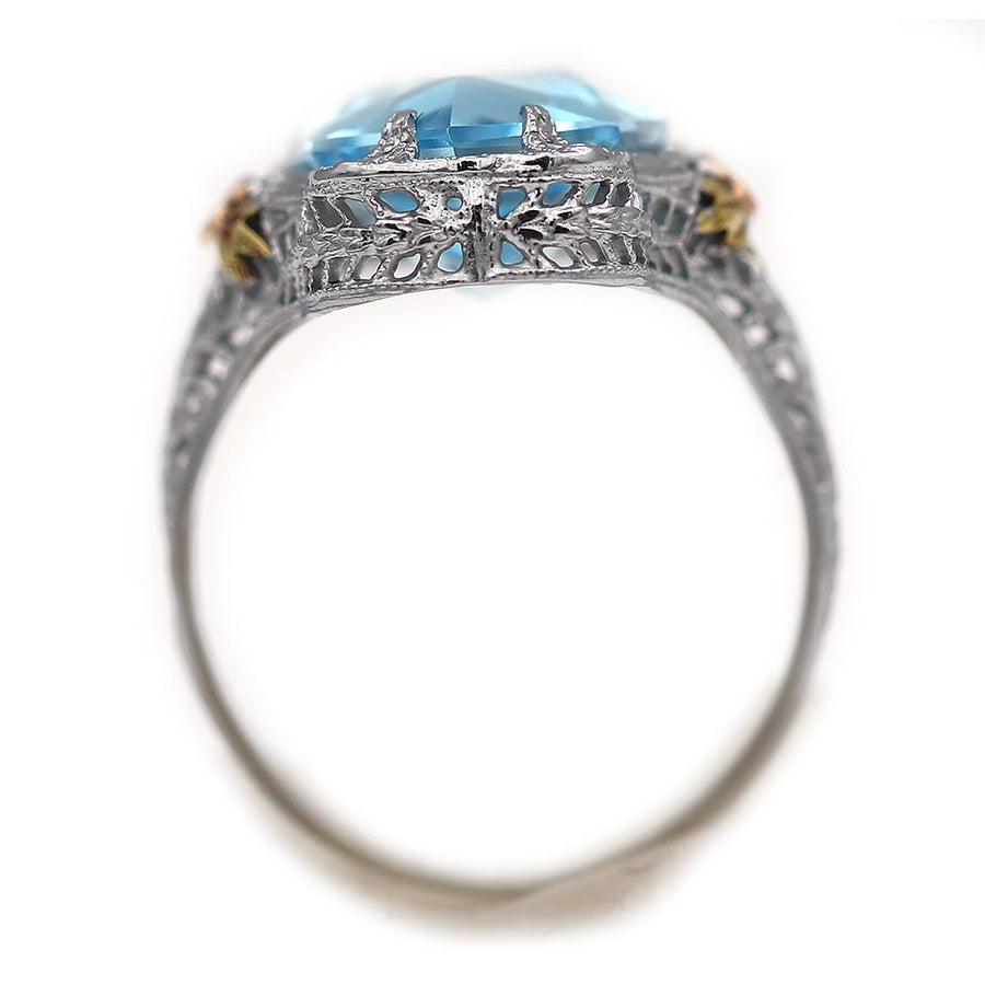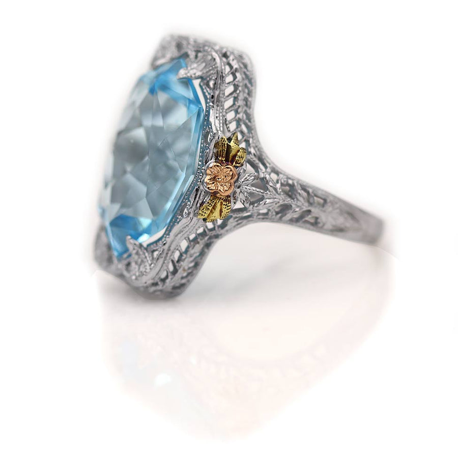 The Lightfoot ring is an authentic Art Deco cocktail ring, circa 1930s, featuring a sky blue 5.50 vintage natural moval cut aquamarine flanked by two tone yellow and rose gold floret petals. Crafted in the 1930's in gleaming 10 kt white gold, rose and yellow gold, accentuated with milgrain and floral engravings and a beautiful open work gallery. A magnificent cocktail ring, in pristine condition.