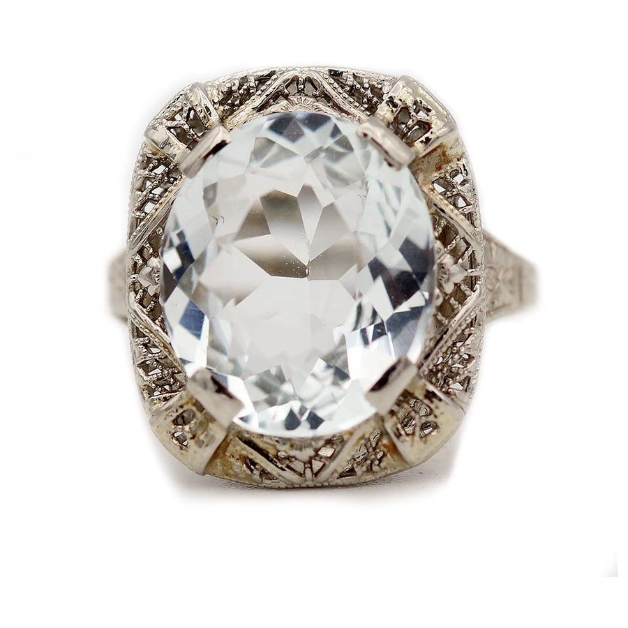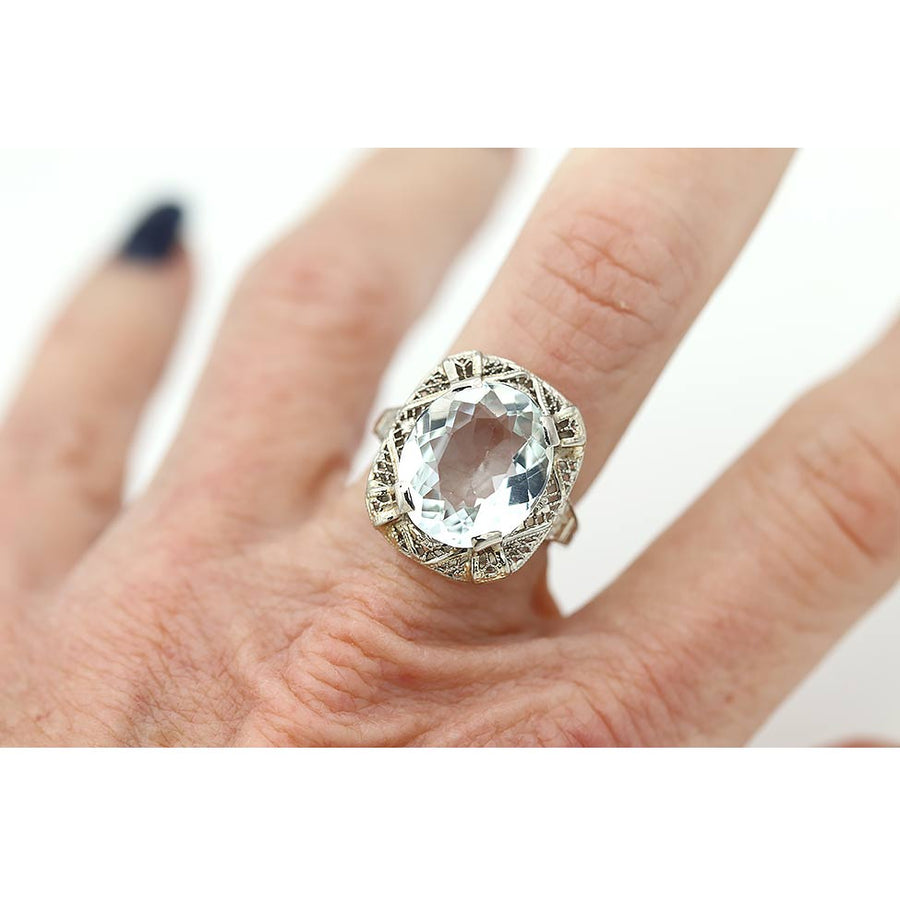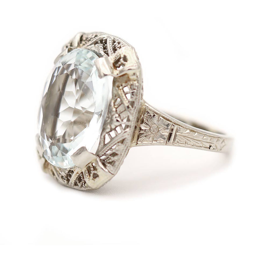 The Krav ring is an authentic vintage aquamarine engagement ring from the Art Deco era circa 1930s. The ring features a natural approximate 10.00 carat natural placid blue oval cut aquamarine. Crafted in 14 karat white gold and accentuated with open metal work and delicate milgrain and filigree engravings. A lovely alternative gemstone engagement ring. Perfect to wear on either hand, in very good condition.