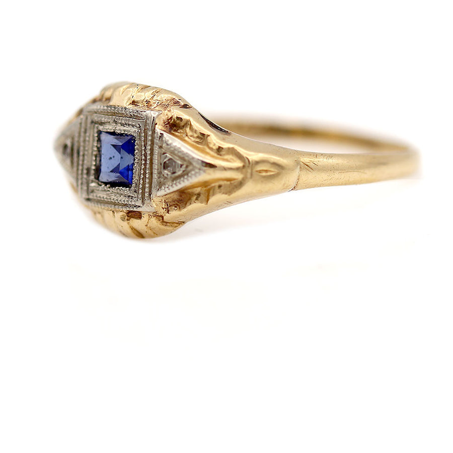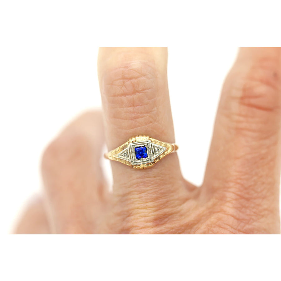 The Alter ring is an authentic vintage sapphire engagement ring, circa 1940's. This ring showcases a .20 carat synthetic square cut sapphire residing in a geometric two tier square frame, flanked by two (2) dainty single cut diamond accents. Beautifully crafted in 14 Kt two tone gold, and accentuated with delicate milgrain engravings. A sweet dainty vintage piece, in good condition.