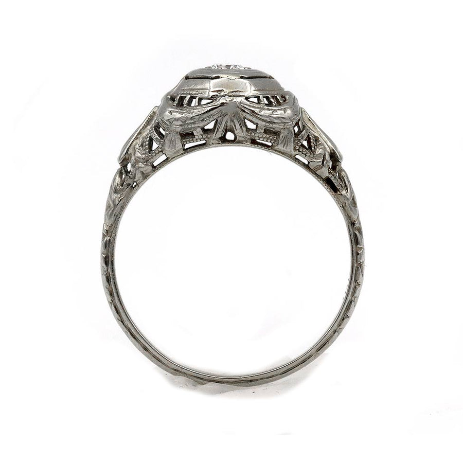 The Vads ring is an authentic vintage engagement ring from the Art Deco era circa 1930s. The ring boasts a .15 carat old European cut diamond of G color, VS2 clarity, residing in a geometric octagonal frame. Crafted in 18 karat white gold, completed with open metal work and filigree engravings. A classic vintage piece, in good condition with the perfect amount of patina.