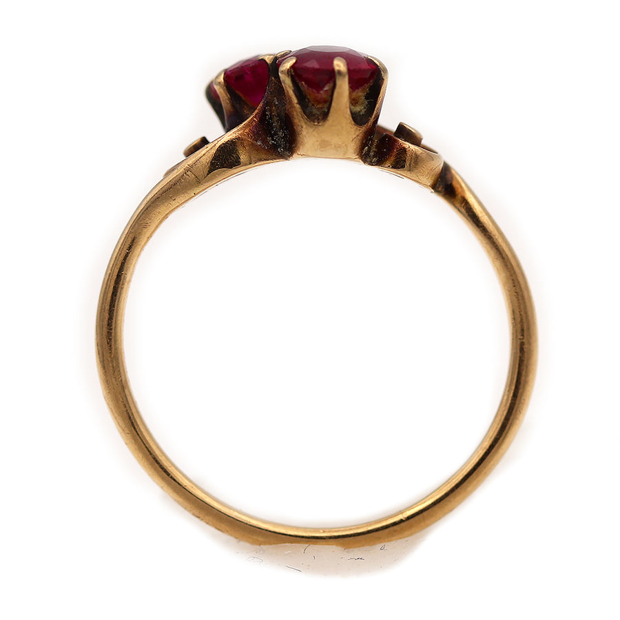 The North Country ring is an authentic antique engagement ring from the Victorian era circa 1900s. This sweet ring boasts two (2) synthetic round cut rubies, weighing .70 ctw, beautifully set within 14 kt rosy-yellow gold. Perfect to wear on either hand. As sweet as can be, in good condition.