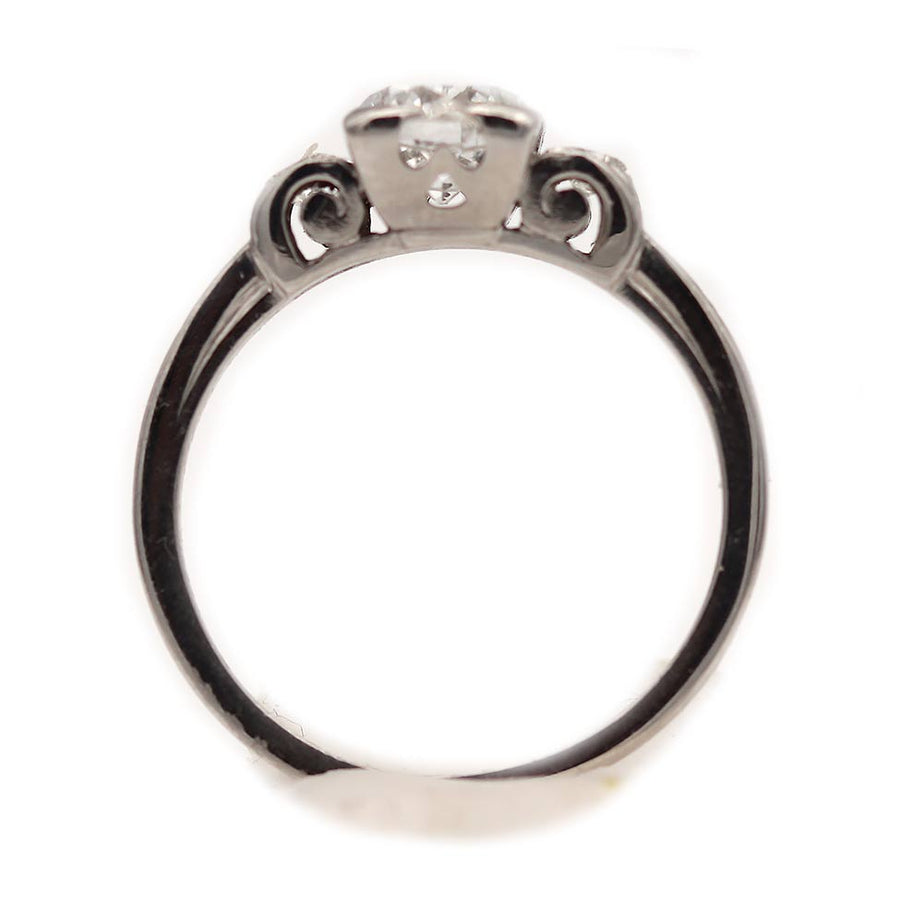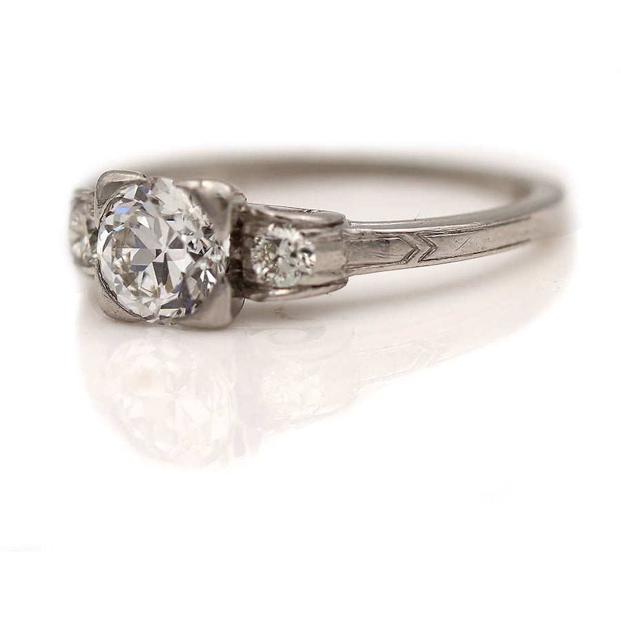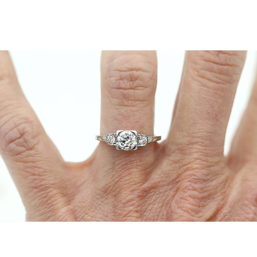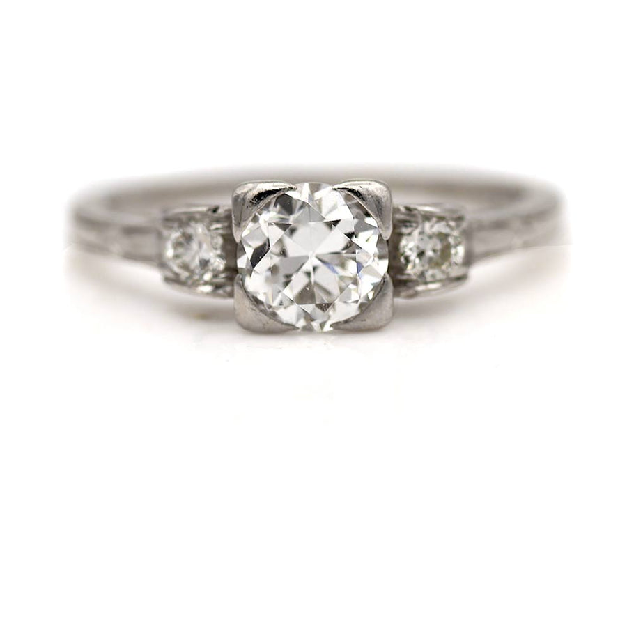 The Nestico ring is an authentic vintage engagement ring from the Art Deco era, circa 1930's. This ring showcases a .60 carat old European cut diamond of G color and VS1 clarity, residing within a geometric square frame flanked by two (2) old mine cut diamond accents. Beautifully crafted in platinum, accentuated with delicate milgrain engravings. A consummate three stone ring, stamped 1930, and in very good condition.