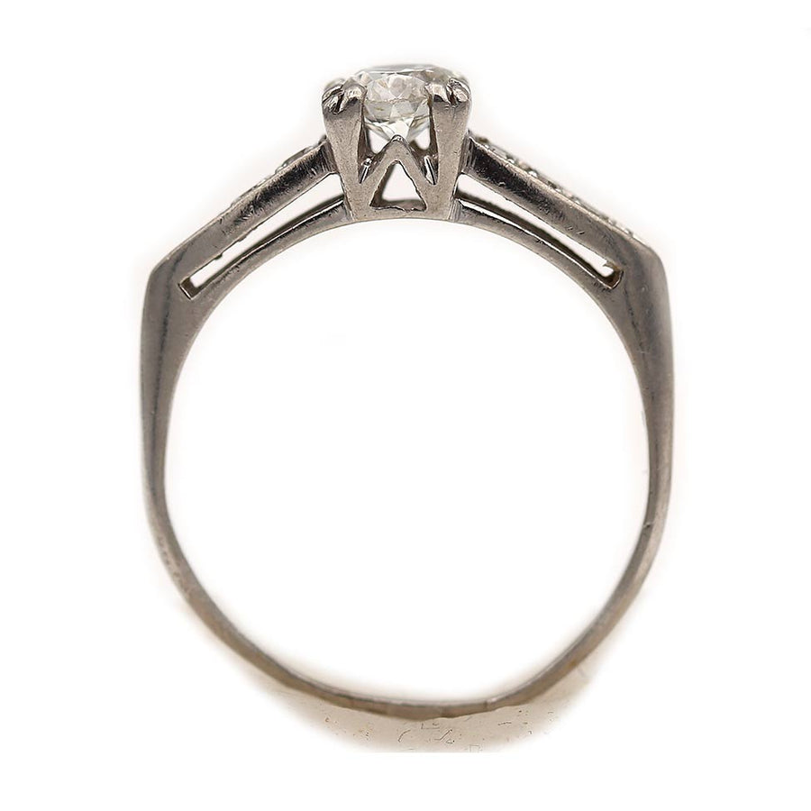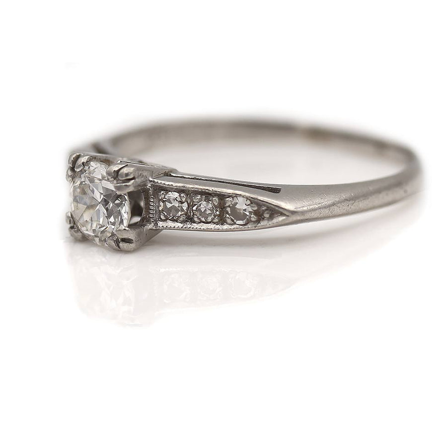 The Margarita is an authentic vintage engagement ring from the Art Deco era circa 1940's. The ring features a bright-white AGI certified .55 carat old European cut diamond of F color, VS2 clarity. The diamond is flanked by 6 single cut diamond accents. Crafted in platinum with trefoil prongs, accentuated with delicate milgrain engravings. A consummate 1940's vintage ring. In excellent condition.