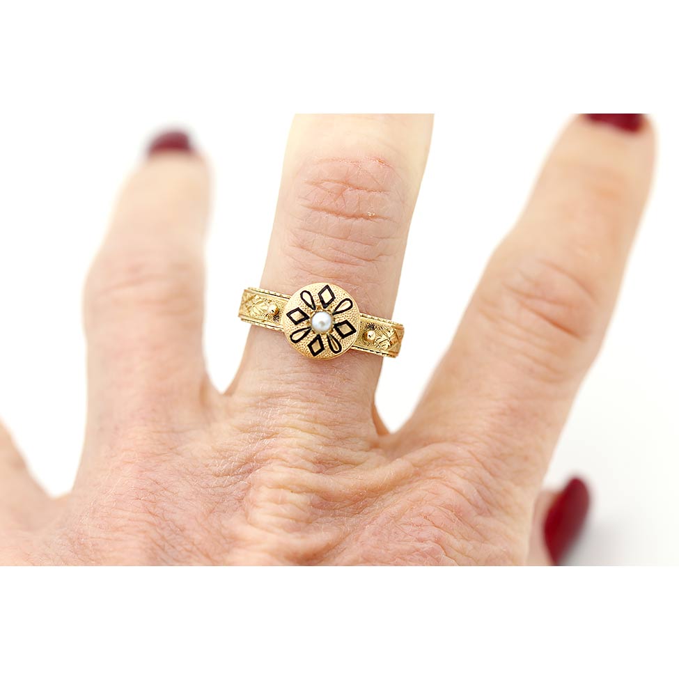 Antique Georgian 9 Kt Yellow Gold Pearl Onyx Enamel Mourning Ring