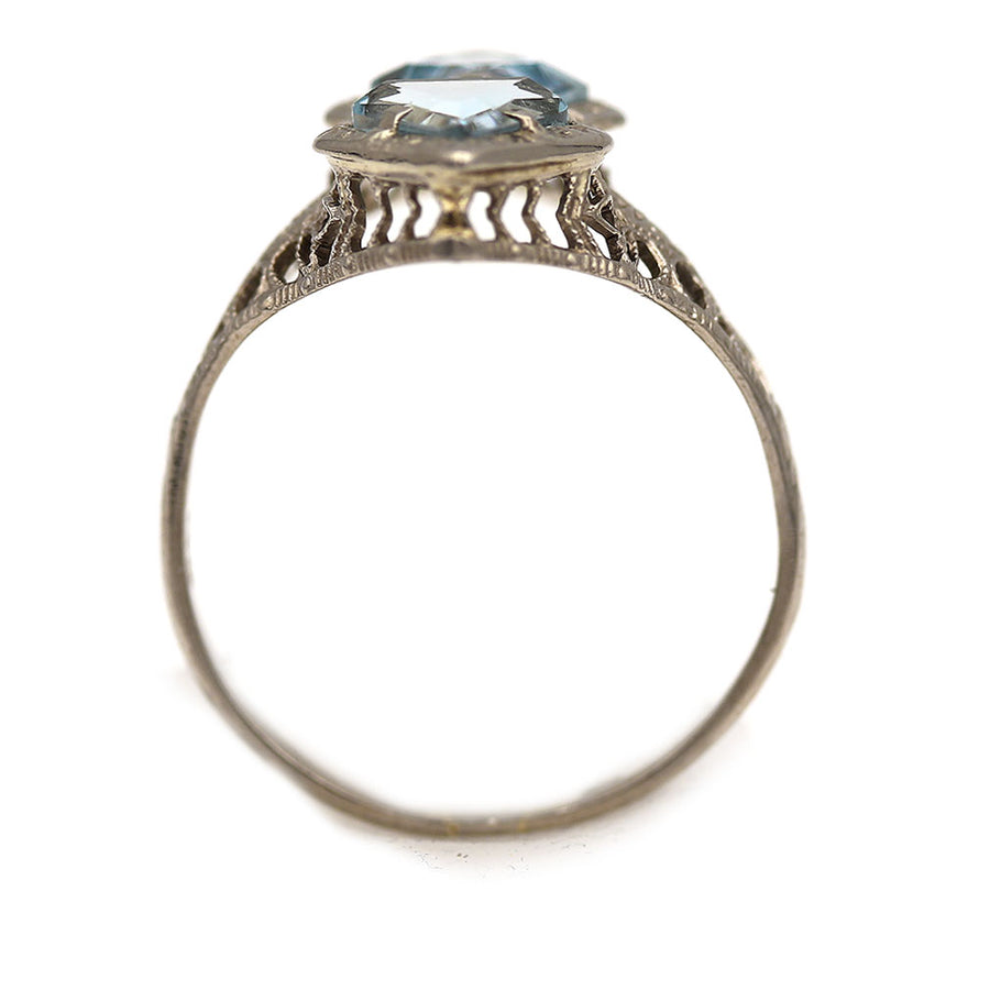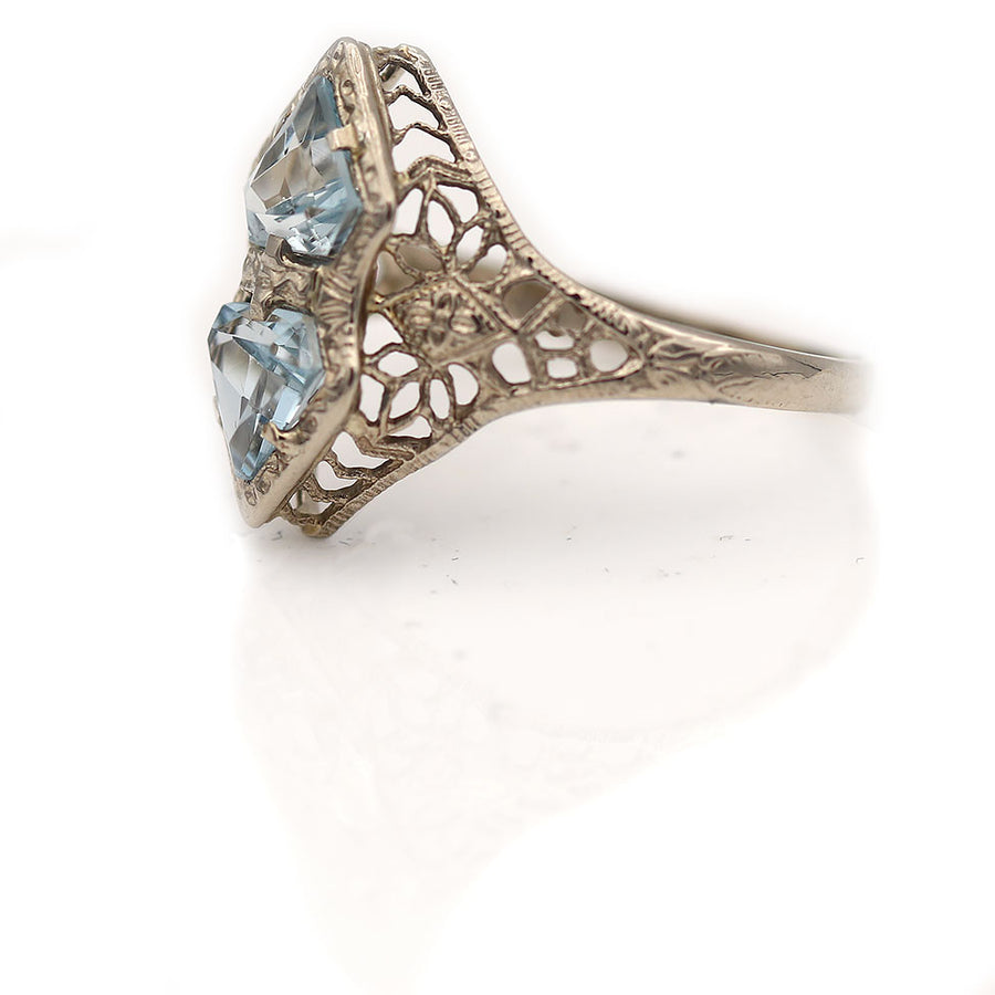 The Arga ring is an authentic vintage aquamarine ring from the Art Deco era, circa 1930s. This unique ring boasts two natural, sky blue, kite shape aquamarines weighing approximately 1.00 carat. Beautifully crafted in 14 kt white gold and accentuated with open metal work and filigree engravings. A beautiful non-diamond ring to wear on either hand. They don't come any finer. In very good condition.