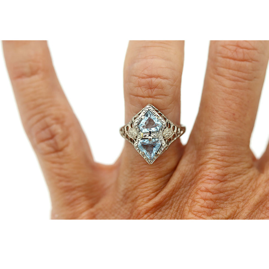 Art Deco 1.00 CTW Two Stone Kite Shape Aquamarine Engagement Ring