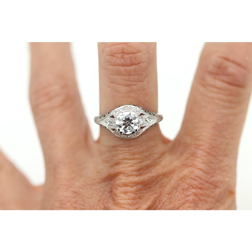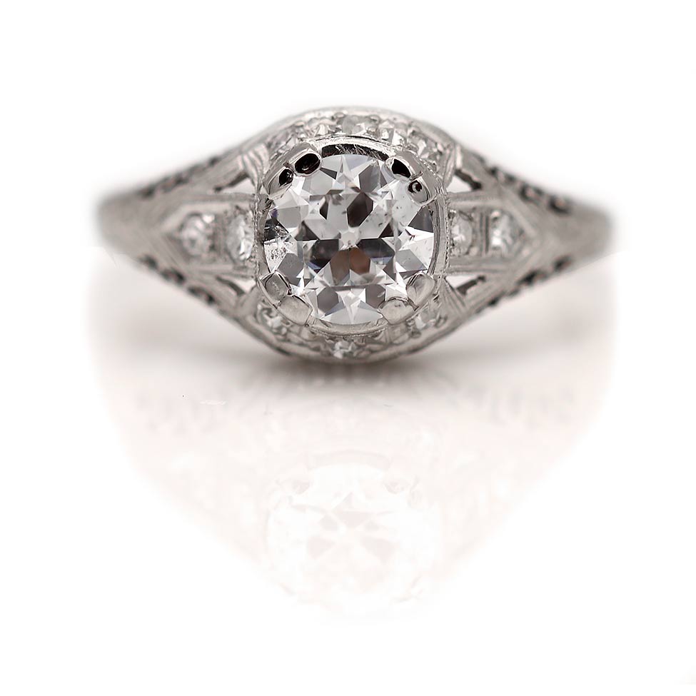 The Mostel ring is an authentic vintage diamond engagement ring from the Art Deco era, circa 1930s. This ring showcases a .91 carat old European cut diamond of D color and I1 clarity surrounded by ten (10) single cut diamond accents. Crafted in platinum and accentuated with delicate milgrain engravings and open metal work. A timeless vintage piece, in good condition.