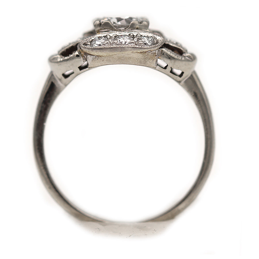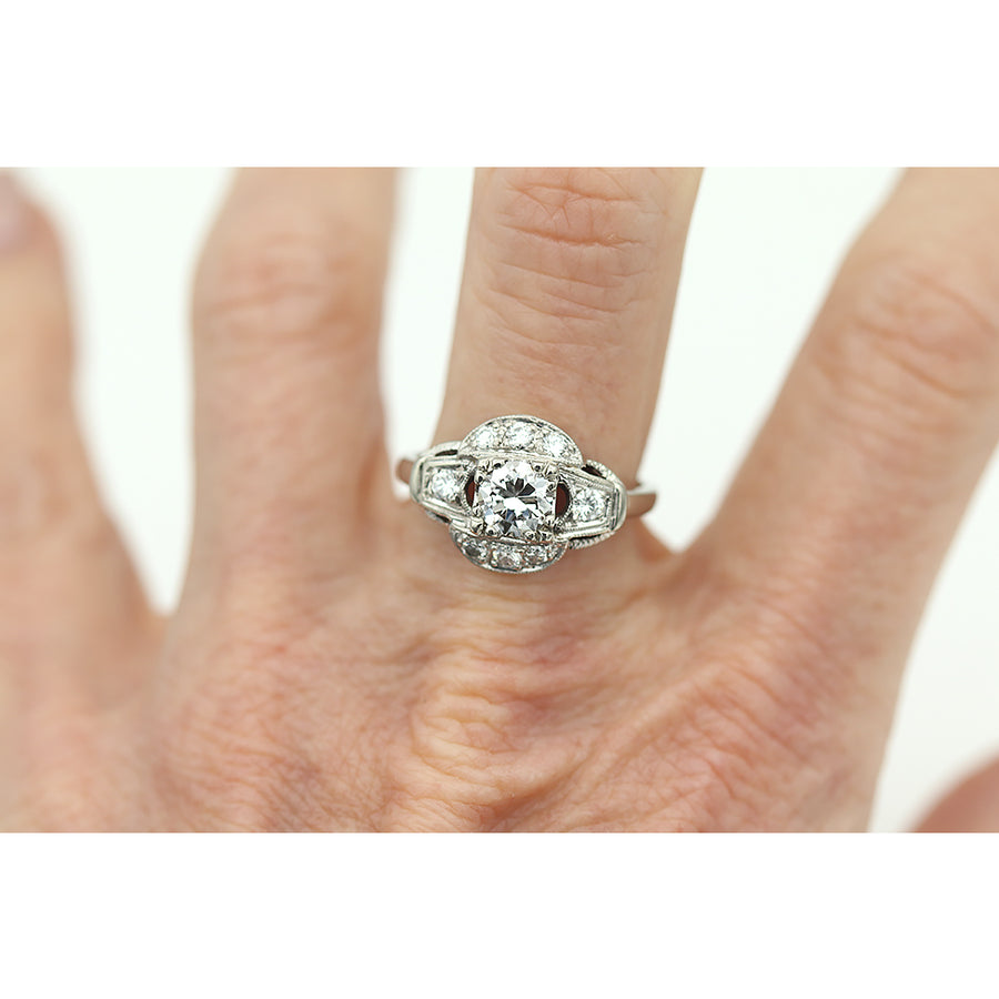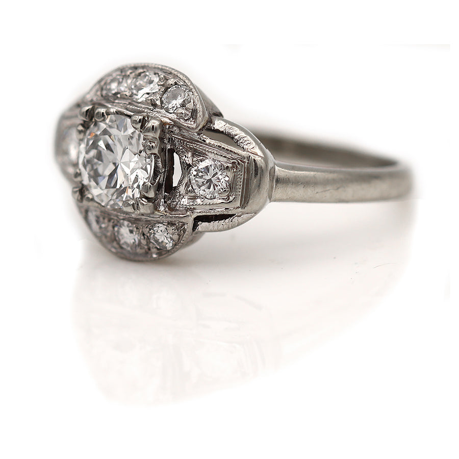 The Moodie ring is an authentic vintage engagement ring from the Art Deco era, circa 1940s. This ring features a .66 carat old European cut diamond, accompanied by a GIA certificate stating E color and SI1 clarity, surrounded by eight (8) transitional cut diamond accents. Beautifully crafted in 14 kt white gold, accentuated with delicate migrain engravings. As pretty as can be. In very good condition.