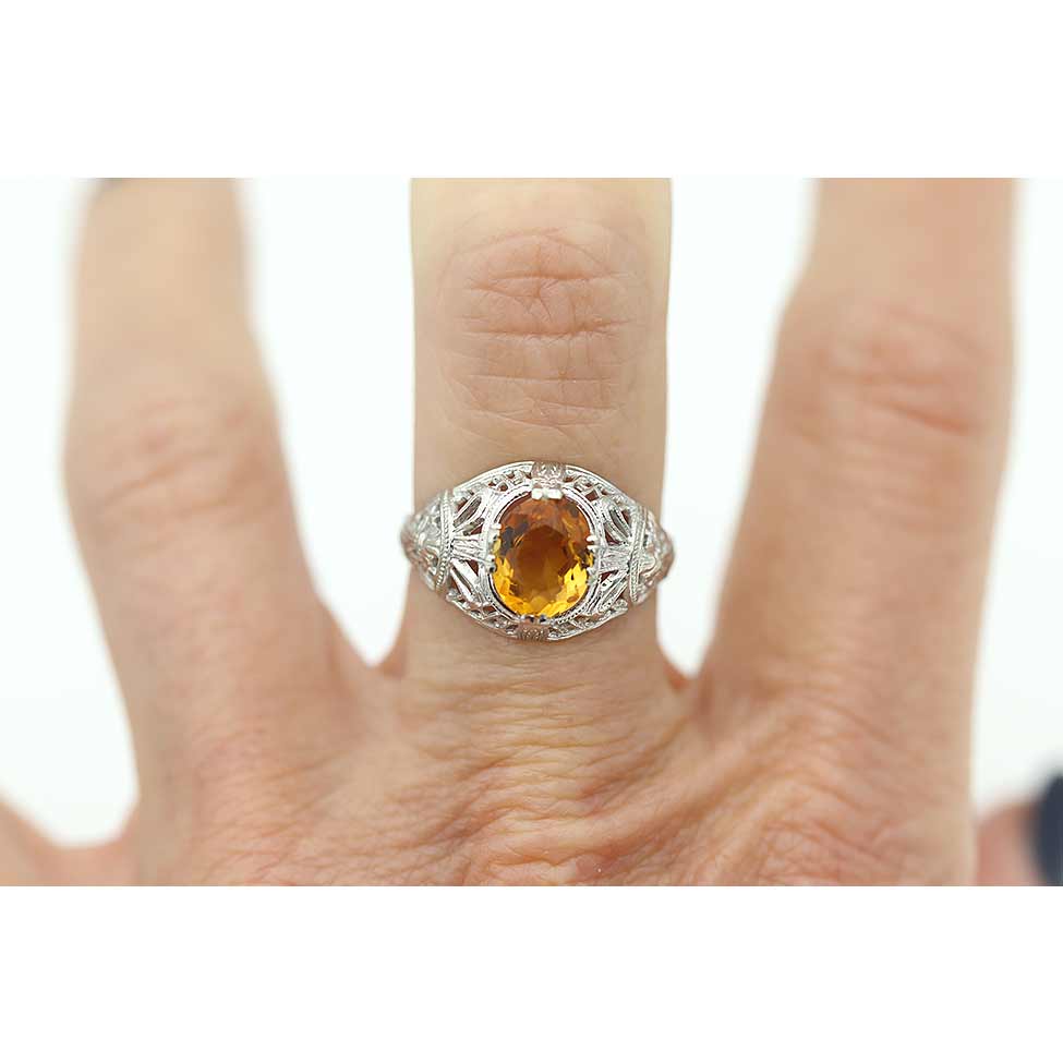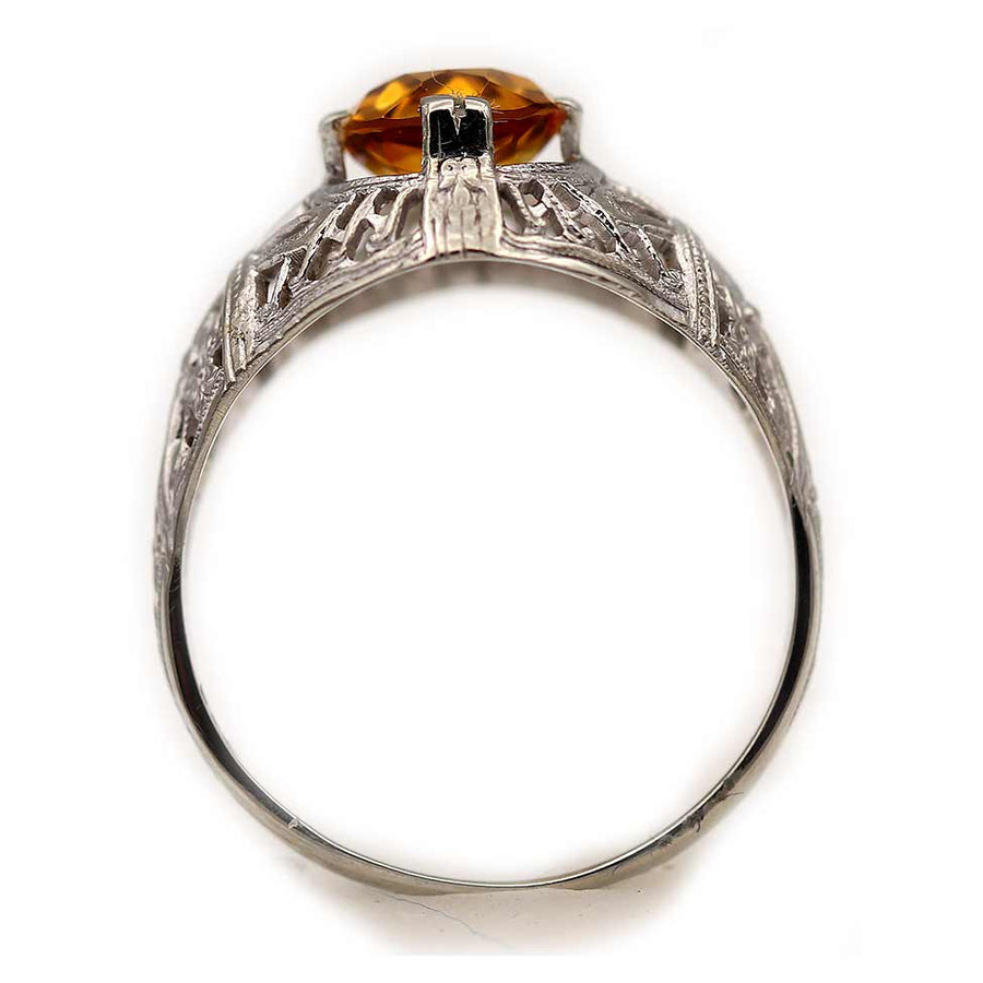 The Morning ring is an authentic vintage citrine ring from the Art Deco era, circa 1930s. This ring features a deep orange, oval cut citrine, weighing approximately 1.25 ct. Beautifully crafted in 14 kt white gold, and accentuated with open metal work and delicate milgrain and filigree engravings. A beautiful non-diamond engagement ring from the Art Deco era. In very good condition.