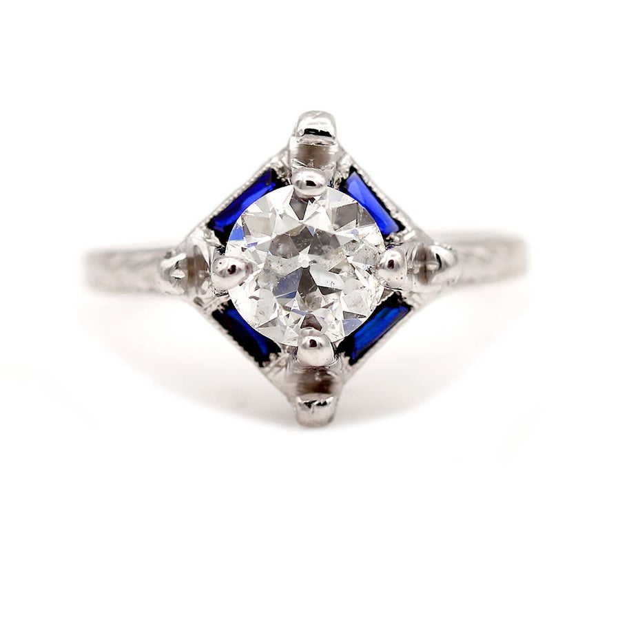 The Deena ring is an authentic vintage diamond engagement ring from the Art Deco era, circa 1930s. This ring showcases a GIA certified 1.16 carat old European cut diamond of F color and I1 clarity, surrounded by four (4) synthetic sapphire baguette accents. Beautifully crafted in 20 kt white gold and accentuated with delicate milgrain engravings and filigree engravings, this is a timeless vintage piece, in very good condition.
