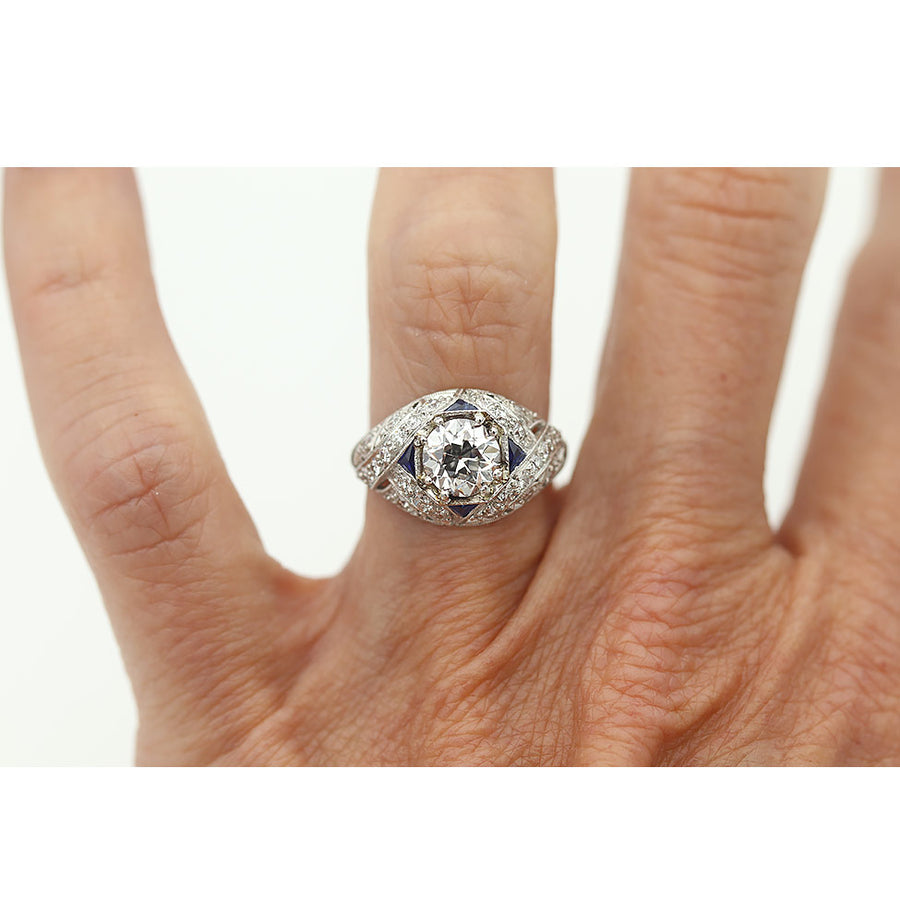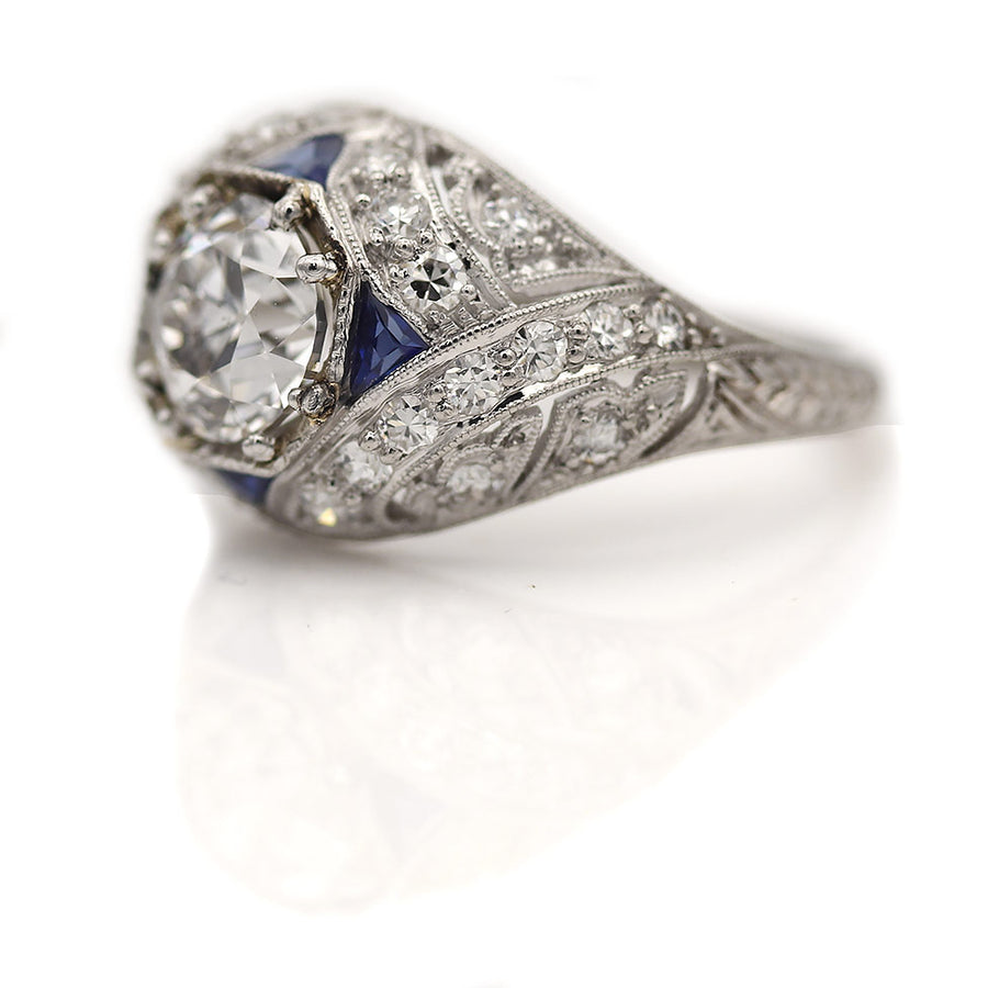 Art Deco 1.68 CTW Old European Cut Diamond Sapphire Vintage Engagement Ring GIA J/SI1