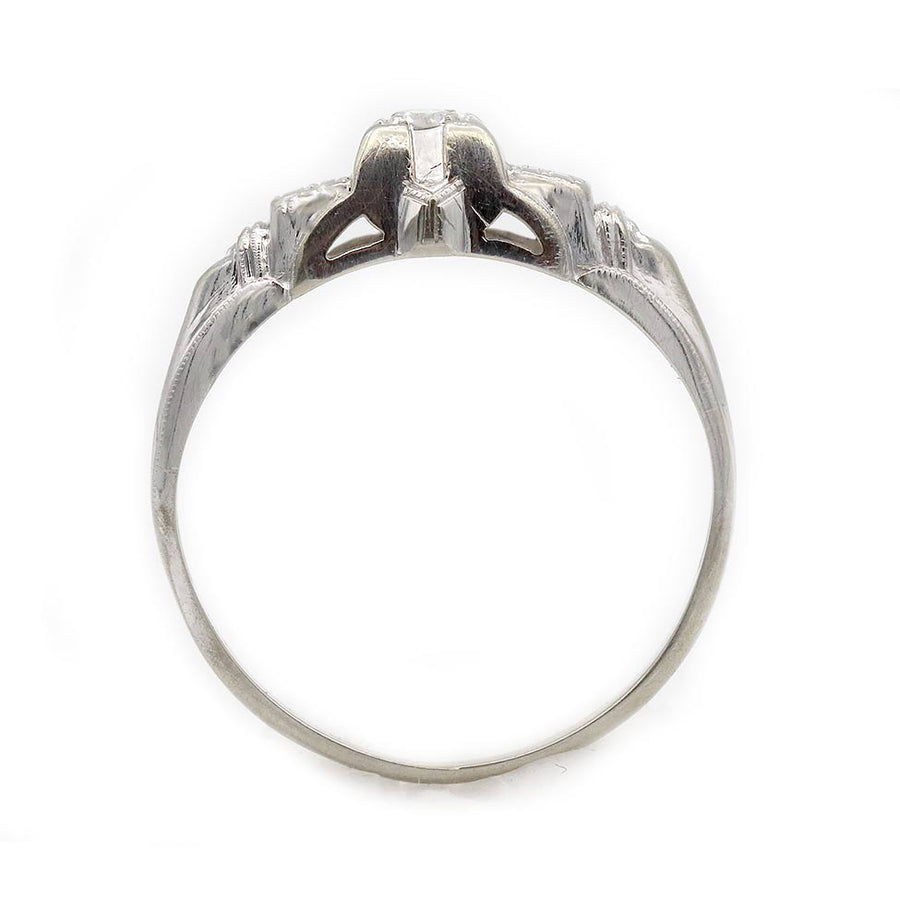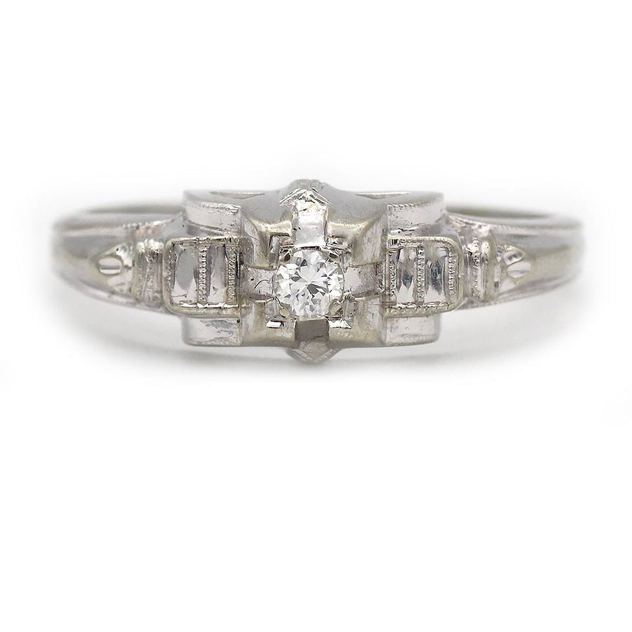 The Suzie ring is an authentic vintage engagement ring from the Art Deco era circa 1930s. The ring features a bright white .10 carat old mine cut diamond of F color, VS2 clarity. Beautifully crafted in 18 karat white gold, accentuated with intricate filigree engravings. A superlative Art Deco ring! A one of a kind ring, in excellent condition!