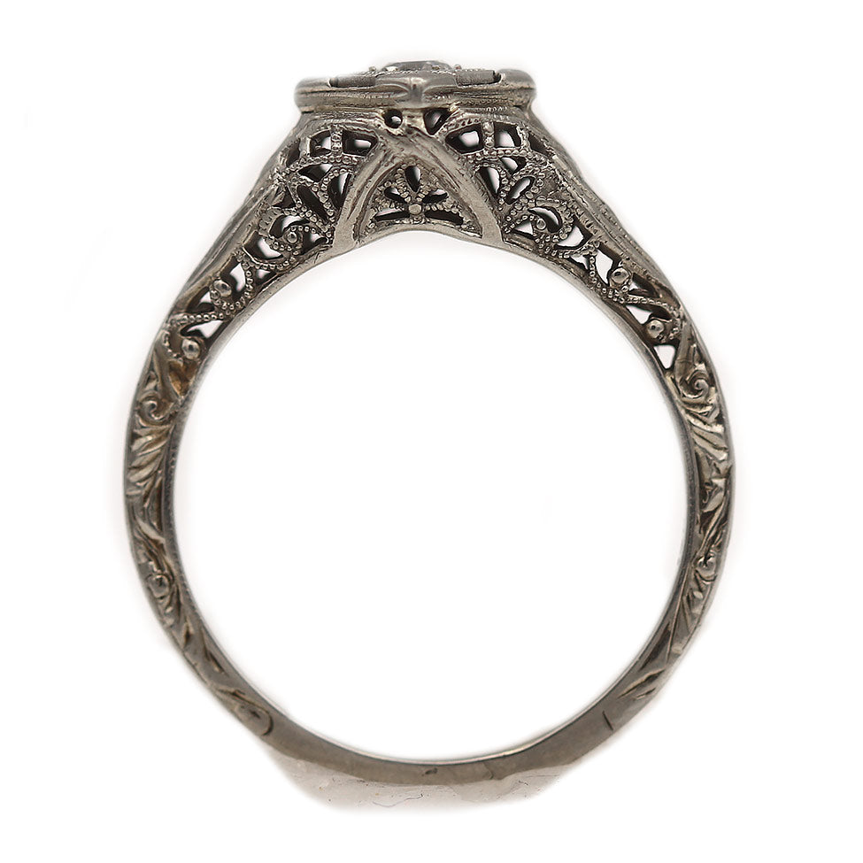 The Moment ring is an authentic vintage engagement ring from the Art Deco era, circa 1930s. This ring features a bright-white .15 carat old European cut diamond residing in a geometric octagonal frame. Beautifully crafted in 14 kt white gold and accentuated with delicate filigree engraving and open metal work. A lovely Art Deco piece. In good condition.