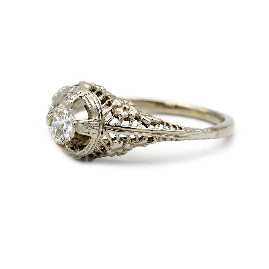 The Scout ring is an authentic Art Deco engagement ring circa 1930's. The ring showcases a .20 carat old European-cut diamond of J color, VS2 clarity. Crafted in 14 karat white gold, beautifully completed with open metal work and floral engravings. A delightful charming piece! Just so sweet. In very good condition.