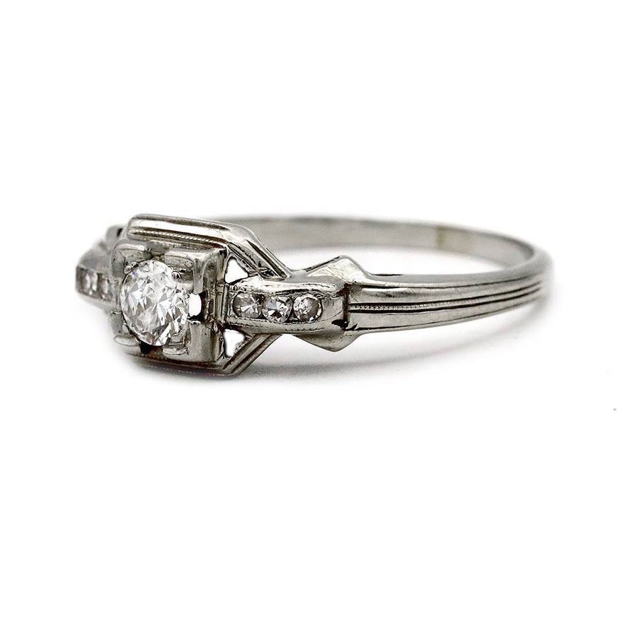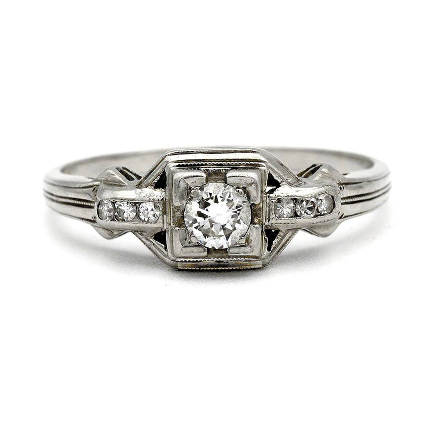 The Lisa E ring is an authentic vintage engagement ring from the Art Deco era circa 1930's. The ring features a .20 carat old European cut diamond of G color, VS2 clarity, residing within a two-tiered geometric square frame. The diamond is flanked by 6 channel set single cut diamond accents. Hand-set onto an 18 karat white gold setting, accentuated with delicate milgrain engravings and a fluted band. A sweet dream ring! In very good condition.