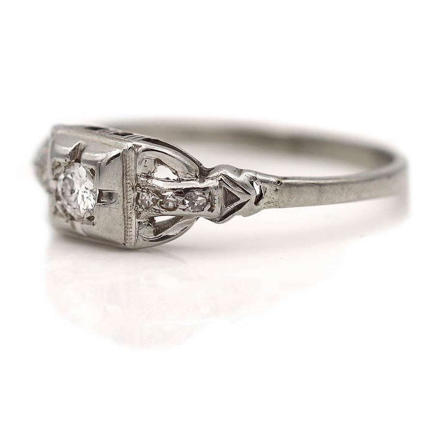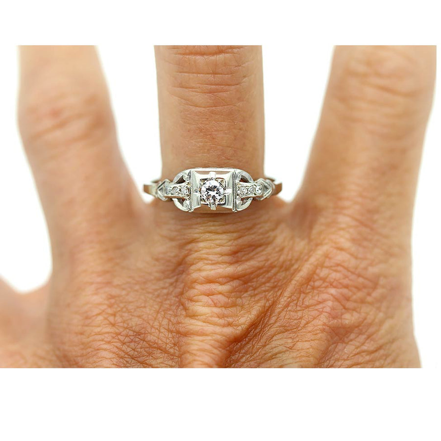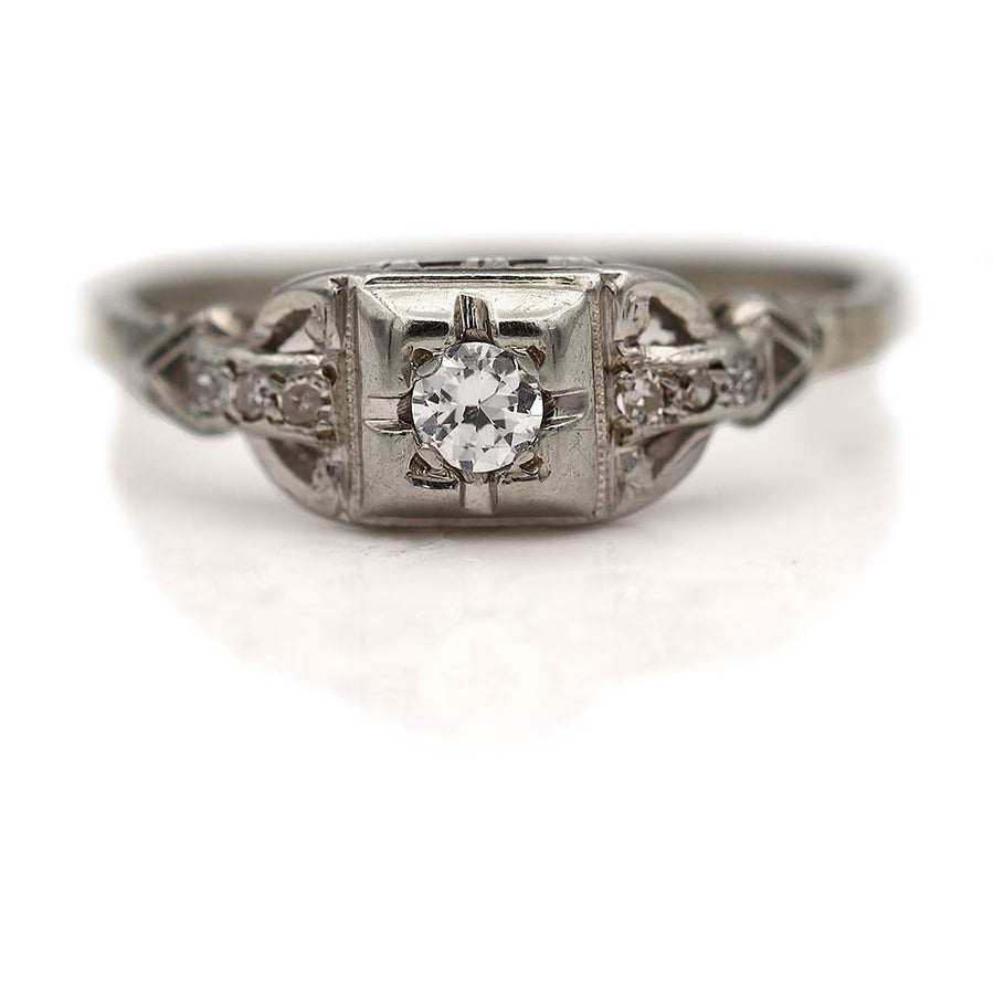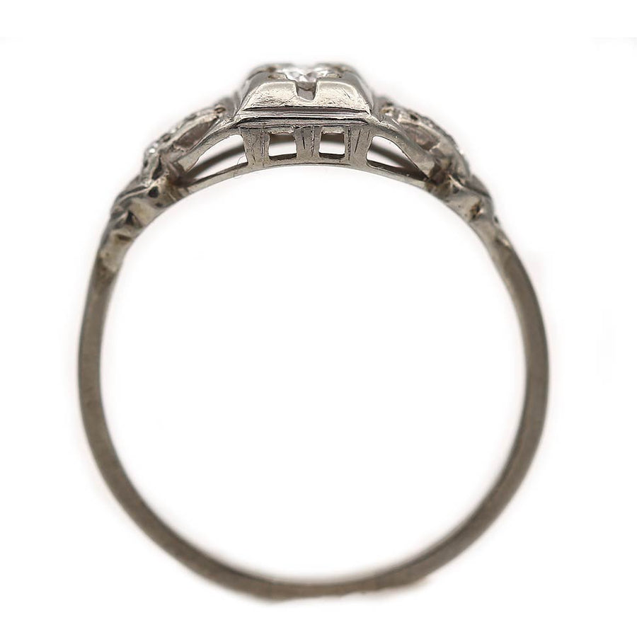 The Specca ring is an authentic vintage ring, circa 1930s. This ring features a glittering .20 carat old European cut diamond of G color and SI2 clarity, flanked by 6 single cut diamond accents. Crafted in 14 karat white gold, accentuated with open metal work and delicate milgrain engravings, this is a classic vintage piece, in very good condition.