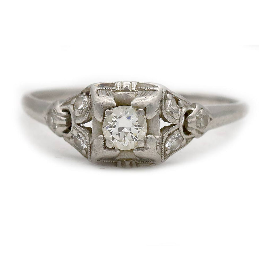 The Madeleine ring is an authentic Art Deco engagement ring circa 1920's. The ring showcases a .20 carat old European cut diamond of H color, VS2 clarity, residing in a square frame. The diamond is surrounded by 6 single cut diamonds accents and a delicate split shank. Finely crafted in platinum, accentuated with delicate milgrain engravings. A sweet vintage jewel with the perfect amount of patina. In very good condition.