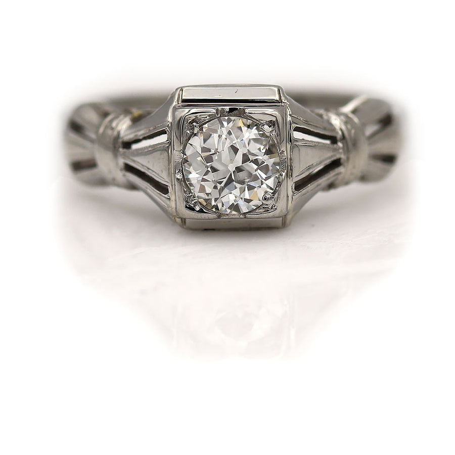The Cari ring is a bold and authentic vintage engagement ring from the Art Deco era circa 1930s. The ring features an GIA certified .43 carat old European cut diamond of I color, VS2 clarity, residing within a geometric square frame. Hand-set onto a 18 karat white gold setting, completed with open metal work, delicate filigree engravings and a gorgeous tapered band. A lovely vintage find, in very good condition.