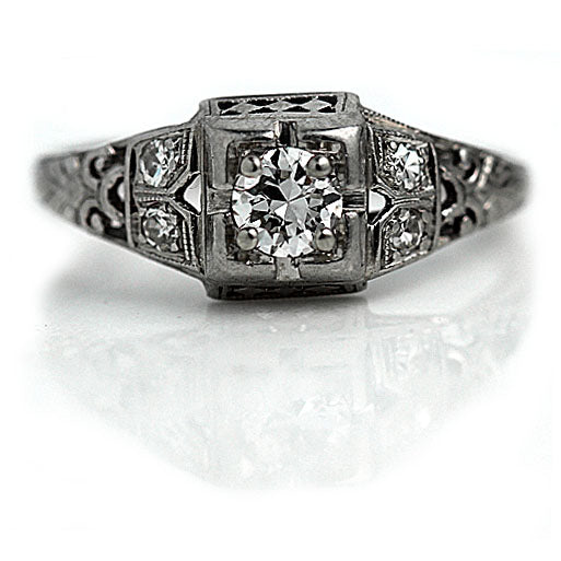 The Neveah ring is an authentic vintage diamond engagement ring from the Art Deco Era circa 1930s. The ring features a .35 carat old European cut diamond of F color, SI1 clarity, residing in a geometric square frame. The diamond is flanked by 4 single cut diamond accents. Crafted in platinum, accentuated with swirling metal work and filigree engravings. A beautiful low-profile vintage jewel. In very good condition.