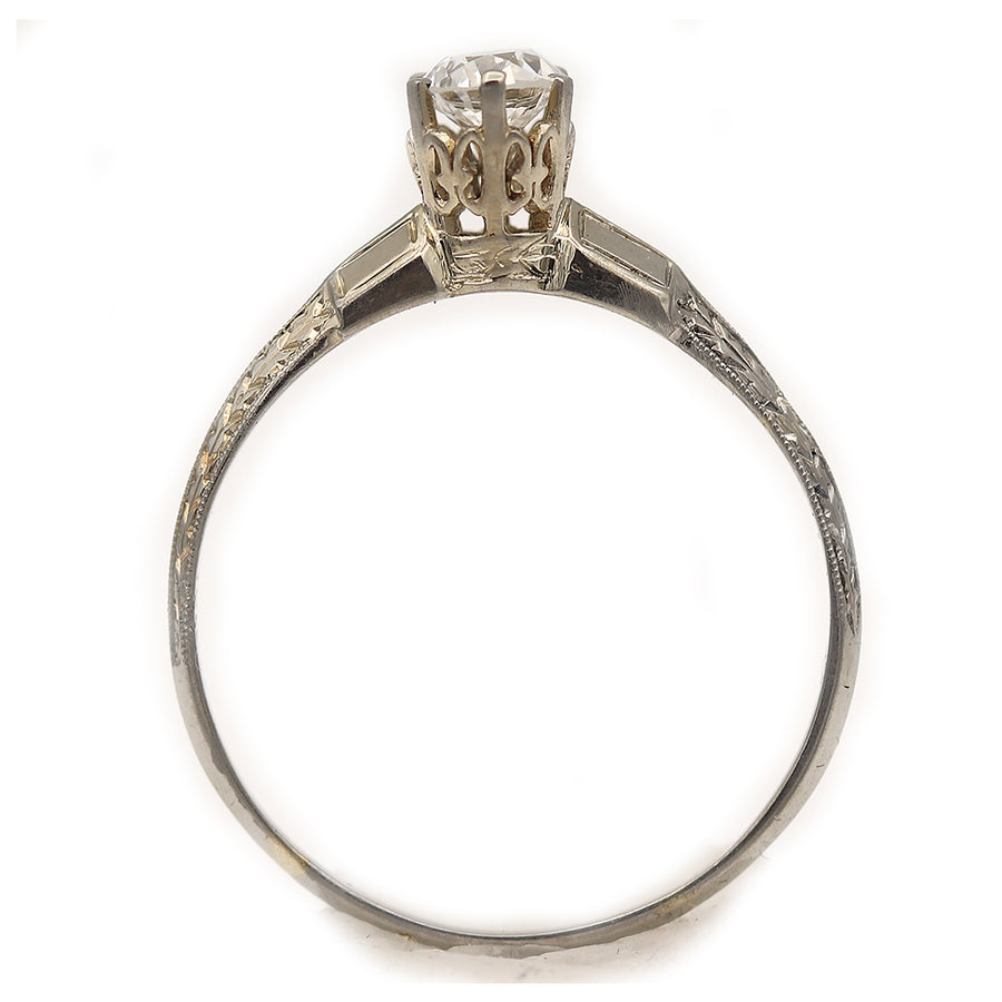 The Ipanema ring is an authentic vintage solitaire engagement ring from the Art Deco era, circa 1930's. The ring features a glittering .48 carat old European cut diamond accompanied by a GIA certificate stating F color and VS2 clarity. Beautifully crafted in 18 kt white gold, accentuated with delicate filigree engravings. As sweet as can be! in very good condition.
