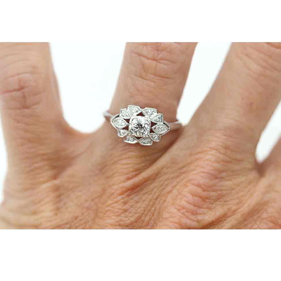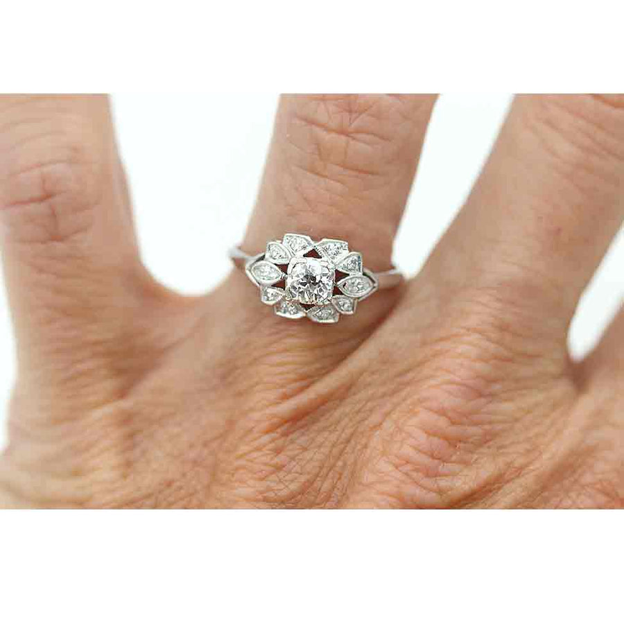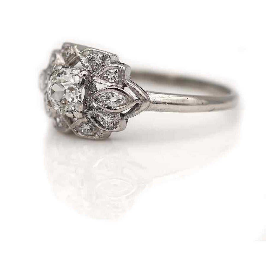 Art Deco .51 CTW Old Mine Cut Diamond Antique Halo Engagement Ring w/ Navette Side Stones