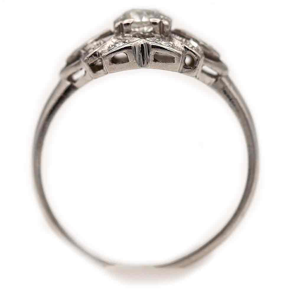 The Nellie ring is an authentic vintage engagement ring from the Art Deco era, circa 1930s. The ring features a glittering .35 carat old mine cut diamond of F color and VS2 clarity, residing in a geometric square frame. The diamond is flanked by two (2) bezel set vintage navette cut diamonds and eight (8)single cut diamond accents. Beautifully crafted in platinum, accentuated with milgrain engravings. As sweet and lovely as can be. In good condition.