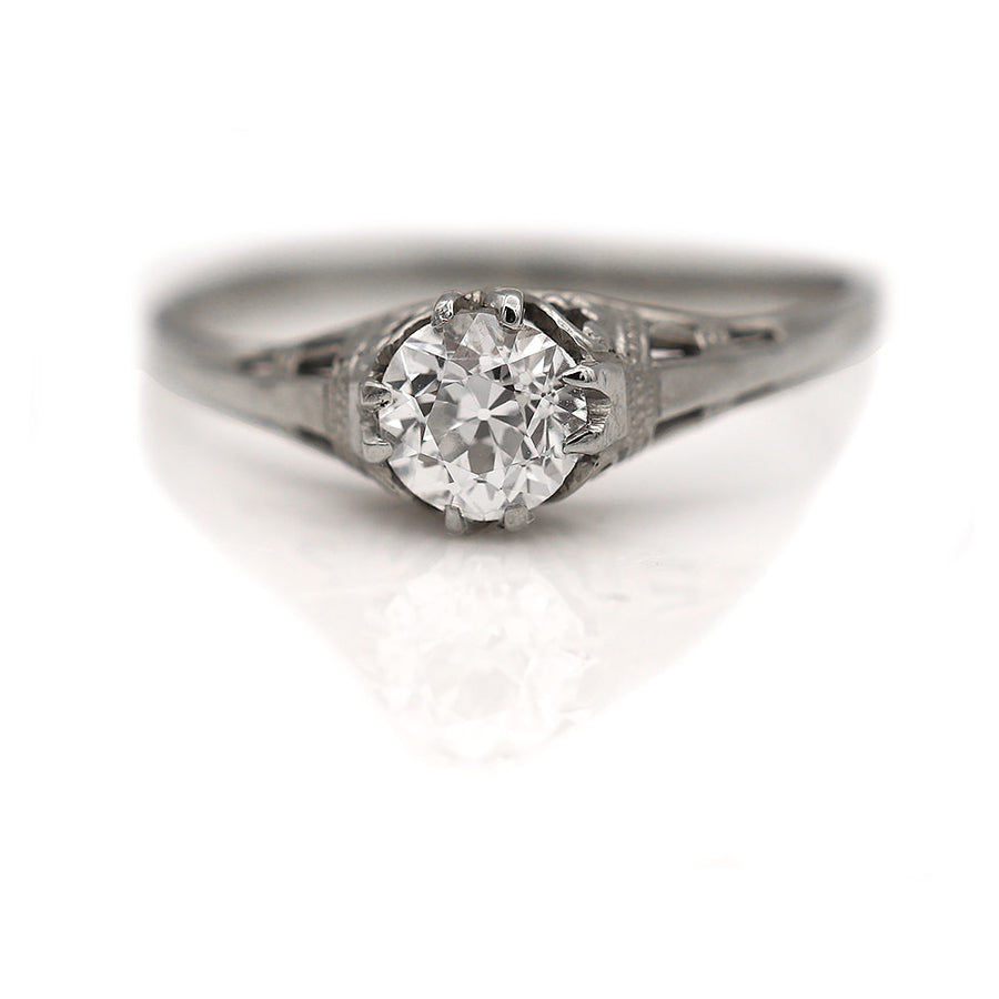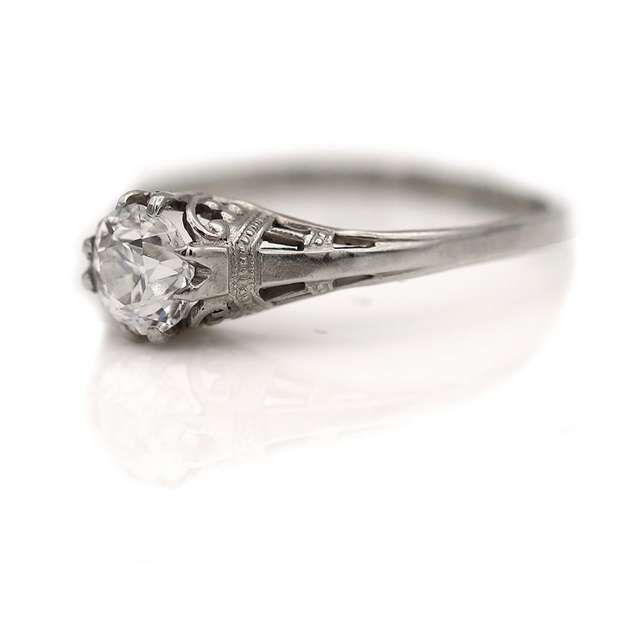 The Ross ring is an authentic vintage engagement ring from the Art Deco era, circa 1930s. This ring features a bright-white .55 carat old European cut diamond accompanied by an AGI diamond report stating F color and VS2 clarity. Beautifully crafted in 10 kt white gold, and accentuated with delicate filigree engravings and open metal work. A lovely Art Deco ring in very good condition.