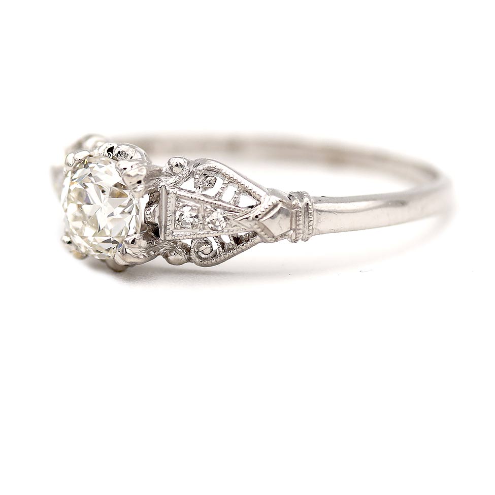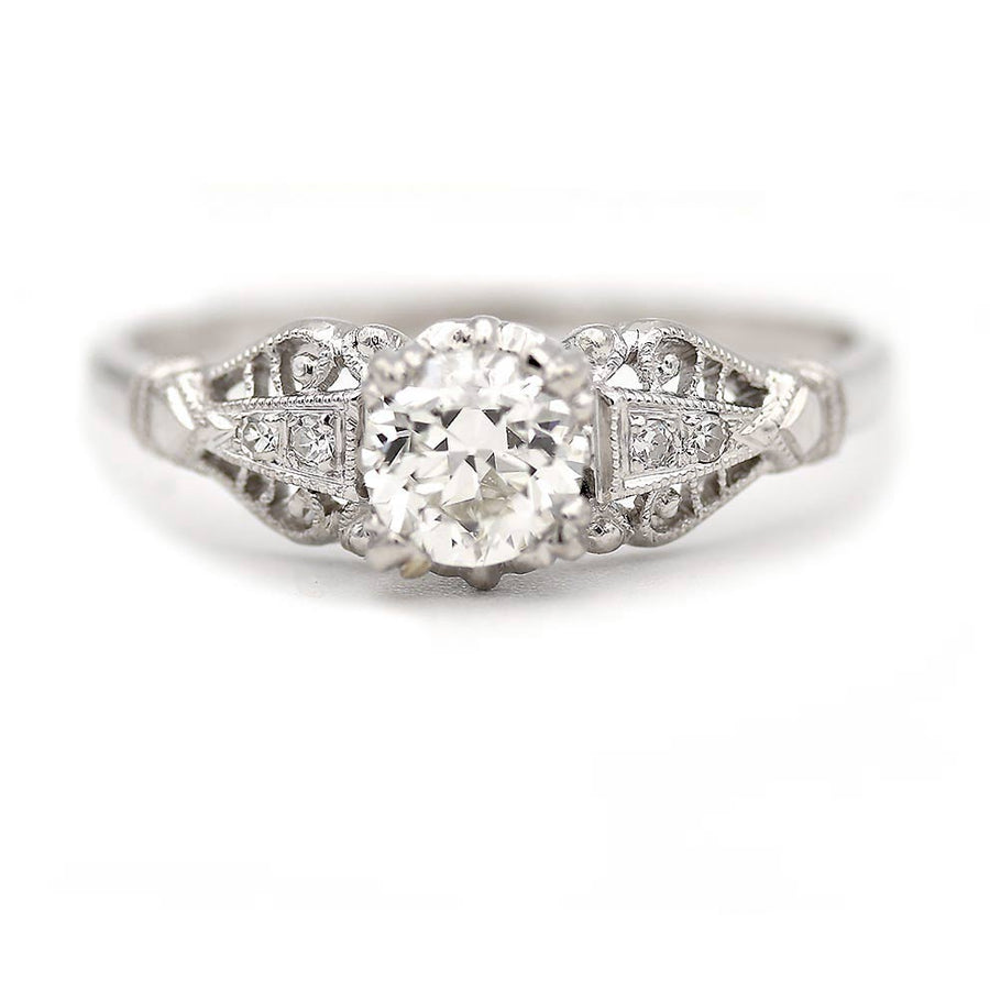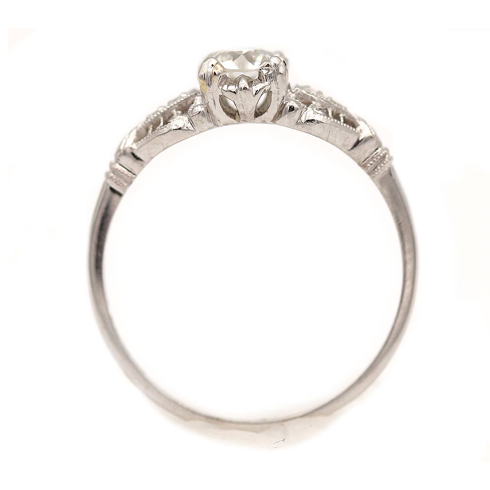 The Warrie ring is an authentic vintage engagement ring from the Art Deco era, circa 1930s featuring a .47 carat GIA old European cut diamond stating F color and VS1 clarity. This stunning diamond is flanked by 4 single cut diamond accents, all beautifully crafted in platinum, and accentuated with open metal work and intricate milgrain engravings. This is a stunning vintage piece in very good condition.
